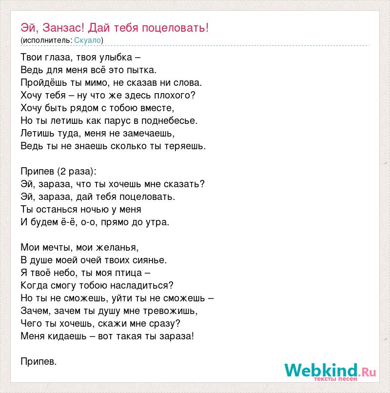 Твои глаза, твоя улыбка – Ведь для меня всё это пытка. Пройдёшь ты мимо, не сказав ни слова. Хочу тебя – ну что же здесь плохого? Хочу быть рядом с тобою вместе, Но ты летишь как парус в поднебесье. Летишь туда, меня не замечаешь, Ведь ты не знаешь сколько ты теряешь. Припев (2 раза): Эй, зараза, что ты хочешь мне сказать? Эй, зараза, дай тебя поцеловать. Ты останься ночью у меня И будем ё-ё, о-о, прямо до утра. Мои мечты, мои желанья, В душе моей очей твоих сиянье. Я твоё небо, ты моя птица – Когда смогу тобою насладиться? Но ты не сможешь, уйти ты не сможешь – Зачем, зачем ты душу мне тревожишь, Чего ты хочешь, скажи мне сразу? Меня кидаешь – вот такая ты зараза! Припев.
