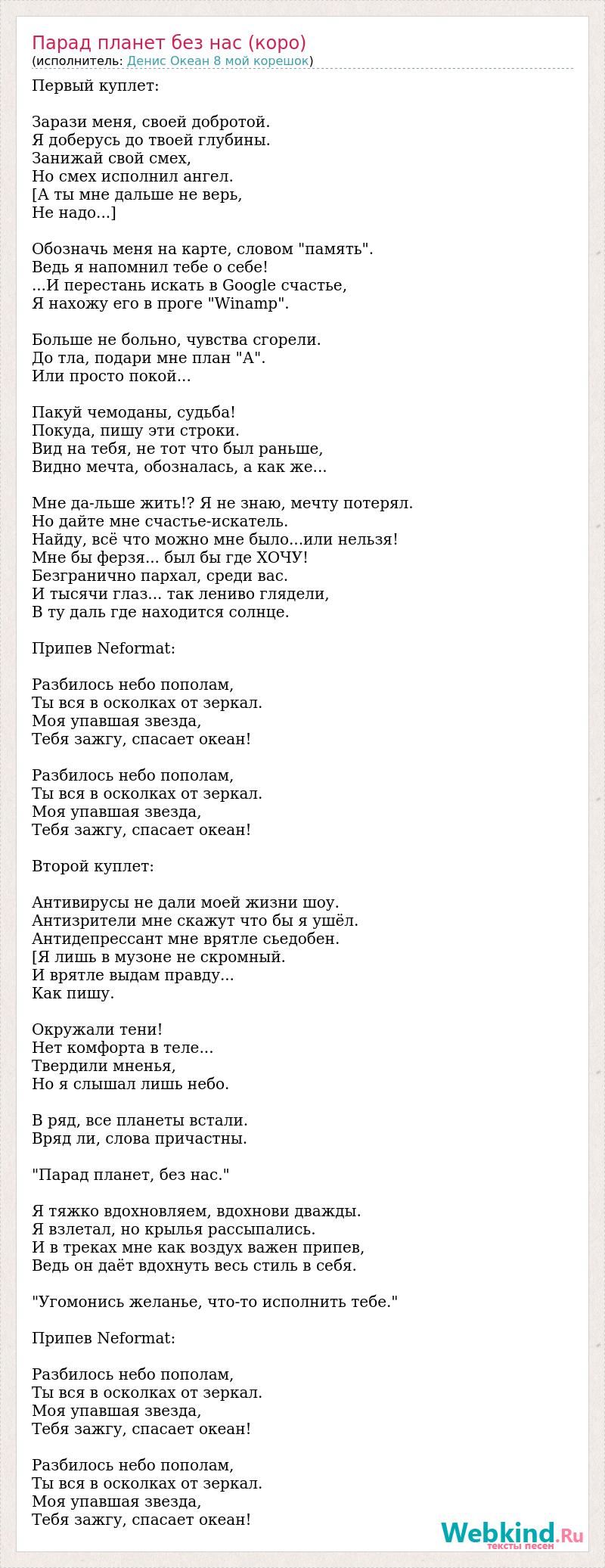 Первый куплет: Зарази меня, своей добротой. Я доберусь до твоей глубины. Занижай свой смех, Но смех исполнил ангел. [А ты мне дальше не верь, Не надо...] Обозначь меня на карте, словом "память". Ведь я напомнил тебе о себе! ...И перестань искать в Google счастье, Я нахожу его в проге "Winamp". Больше не больно, чувства сгорели. До тла, подари мне план "А". Или просто покой... Пакуй чемоданы, судьба! Покуда, пишу эти строки. Вид на тебя, не тот что был раньше, Видно мечта, обозналась, а как же... Мне да-льше жить!? Я не знаю, мечту потерял. Но дайте мне счастье-искатель. Найду, всё что можно мне было...или нельзя! Мне бы ферзя... был бы где ХОЧУ! Безгранично пархал, среди вас. И тысячи глаз... так лениво глядели, В ту даль где находится солнце. Припев Neformat: Разбилось небо пополам, Ты вся в осколках от зеркал. Моя упавшая звезда, Тебя зажгу, спасает океан! Разбилось небо пополам, Ты вся в осколках от зеркал. Моя упавшая звезда, Тебя зажгу, спасает океан! Второй куплет: Антивирусы не дали моей жизни шоу. Антизрители мне скажут что бы я ушёл. Антидепрессант мне врятле сьедобен. [Я лишь в музоне не скромный. И врятле выдам правду... Как пишу. Окружали тени! Нет комфорта в теле... Твердили мненья, Но я слышал лишь небо. В ряд, все планеты встали. Вряд ли, слова причастны. "Парад планет, без нас." Я тяжко вдохновляем, вдохнови дважды. Я взлетал, но крылья рассыпались. И в треках мне как воздух важен припев, Ведь он даёт вдохнуть весь стиль в себя. "Угомонись желанье, что-то исполнить тебе." Припев Neformat: Разбилось небо пополам, Ты вся в осколках от зеркал. Моя упавшая звезда, Тебя зажгу, спасает океан! Разбилось небо пополам, Ты вся в осколках от зеркал. Моя упавшая звезда, Тебя зажгу, спасает океан!