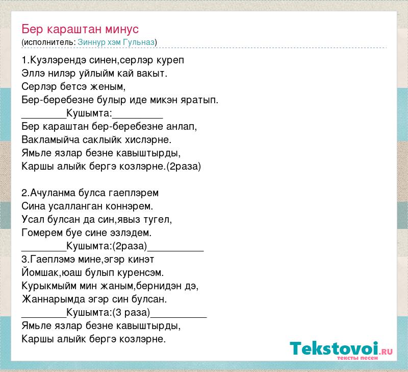 1.Кузлэрендэ синен,серлэр куреп Эллэ нилэр уйлыйм кай вакыт. Серлэр бетсэ женым, Бер-беребезне булыр иде микэн яратып. ________Кушымта:_________ Бер караштан бер-беребезне анлап, Вакламыйча саклыйк хислэрне. Ямьле язлар безне кавыштырды, Каршы алыйк бергэ козлэрне.(2раза) 2.Ачуланма булса гаеплэрем Сина усалланган коннэрем. Усал булсан да син,явыз тугел, Гомерем буе сине эзлэдем. ________Кушымта:(2раза)__________ 3.Гаеплэмэ мине,эгэр кинэт Йомшак,юаш булып куренсэм. Курыкмыйм мин жаным,бернидэн дэ, Жаннарымда эгэр син булсан. ________Кушымта:(3 раза)__________ Ямьле язлар безне кавыштырды, Каршы алыйк бергэ козлэрне.
