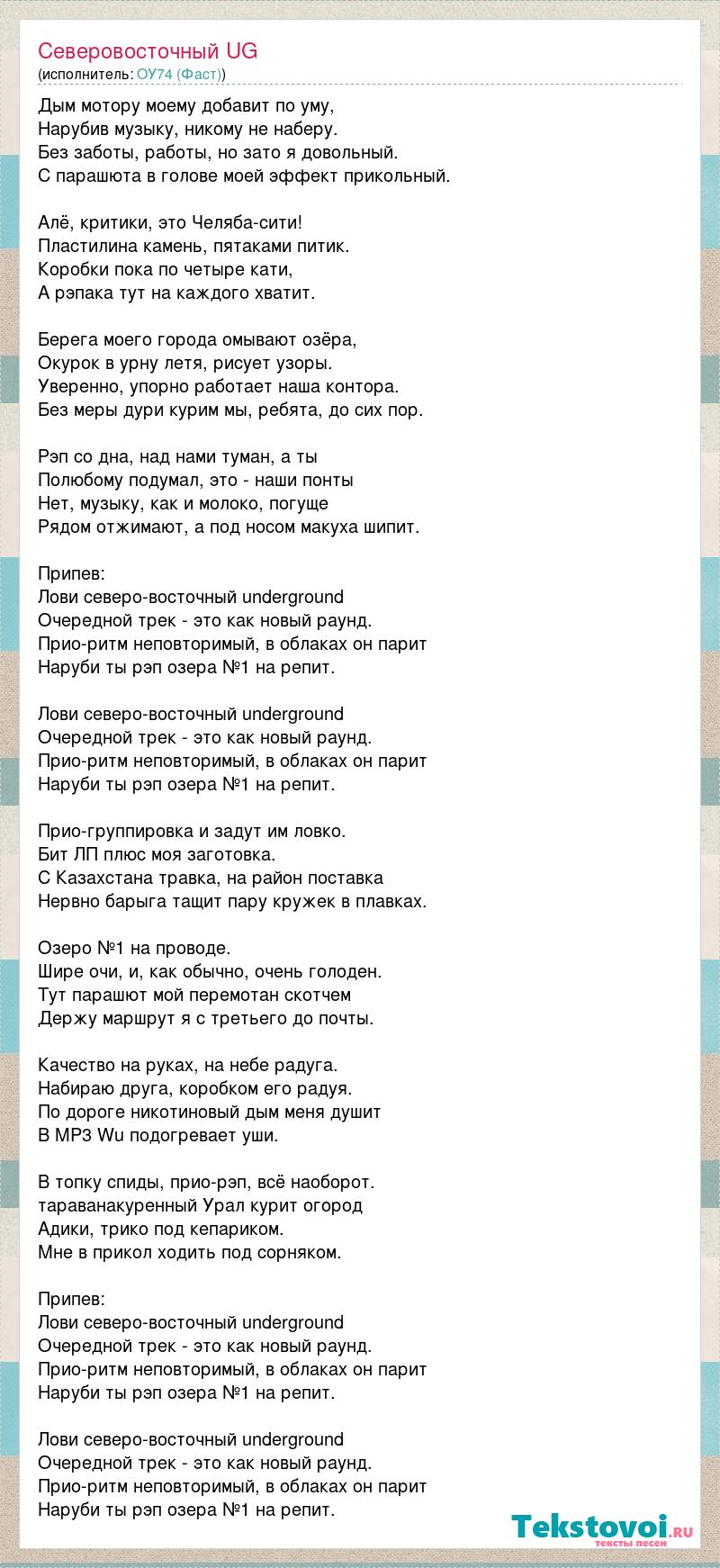 Дым мотору моему добавит по уму, Нарубив музыку, никому не наберу. Без заботы, работы, но зато я довольный. С парашюта в голове моей эффект прикольный. Алё, критики, это Челяба-сити! Пластилина камень, пятаками питик. Коробки пока по четыре кати, А рэпака тут на каждого хватит. Берега моего города омывают озёра, Окурок в урну летя, рисует узоры. Уверенно, упорно работает наша контора. Без меры дури курим мы, ребята, до сих пор. Рэп со дна, над нами туман, а ты Полюбому подумал, это - наши понты Нет, музыку, как и молоко, погуще Рядом отжимают, а под носом макуха шипит. Припев: Лови северо-восточный underground Очередной трек - это как новый раунд. Прио-ритм неповторимый, в облаках он парит Наруби ты рэп озера №1 на репит. Лови северо-восточный underground Очередной трек - это как новый раунд. Прио-ритм неповторимый, в облаках он парит Наруби ты рэп озера №1 на репит. Прио-группировка и задут им ловко. Бит ЛП плюс моя заготовка. С Казахстана травка, на район поставка Нервно барыга тащит пару кружек в плавках. Озеро №1 на проводе. Шире очи, и, как обычно, очень голоден. Тут парашют мой перемотан скотчем Держу маршрут я с третьего до почты. Качество на руках, на небе радуга. Набираю друга, коробком его радуя. По дороге никотиновый дым меня душит В MP3 Wu подогревает уши. В топку спиды, прио-рэп, всё наоборот. тараванакуренный Урал курит огород Адики, трико под кепариком. Мне в прикол ходить под сорняком. Припев: Лови северо-восточный underground Очередной трек - это как новый раунд. Прио-ритм неповторимый, в облаках он парит Наруби ты рэп озера №1 на репит. Лови северо-восточный underground Очередной трек - это как новый раунд. Прио-ритм неповторимый, в облаках он парит Наруби ты рэп озера №1 на репит.