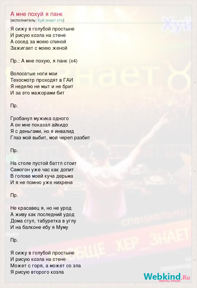 Я сижу в голубой простыне И рисую козла на стене А сосед за моею спиной Зажигает с моею женой Пр.: А мне похую, я панк (x4) Волосатые ноги мои Техосмотр проходят в ГАИ Я неделю не мыт и не брит И за это мажорами бит Пр. Гробанул мужика одного А он мне показал айкидо Я с деньгами, но я инвалид Глаз мой выбит, мой череп разбит Пр. На столе пустой баттл стоит Самогон уже час как допит В голове моей куча дерьма И я не помню уже нихрена Пр. Не красавец я, но не урод А живу как последний удод Дома стул, табуретка в углу И на балконе ебу я Муму Пр. Я сижу в голубой простыне И рисую козла на стене Может с горя, а может со зла Я рисую второго козла