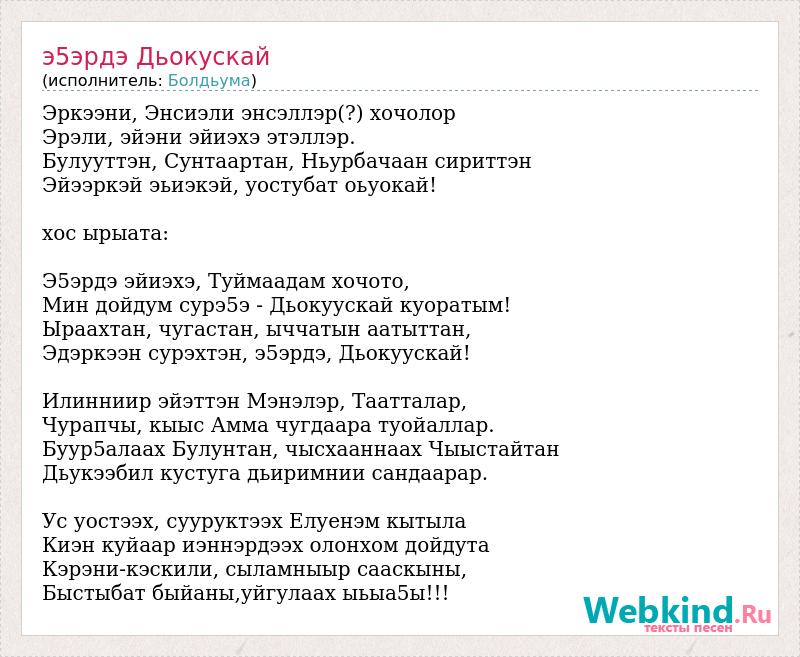 Эркээни, Энсиэли энсэллэр(?) хочолор Эрэли, эйэни эйиэхэ этэллэр. Булууттэн, Сунтаартан, Ньурбачаан сириттэн Эйээркэй эьиэкэй, уостубат оьуокай! хос ырыата: Э5эрдэ эйиэхэ, Туймаадам хочото, Мин дойдум сурэ5э - Дьокуускай куоратым! Ыраахтан, чугастан, ыччатын аатыттан, Эдэркээн сурэхтэн, э5эрдэ, Дьокуускай! Илинниир эйэттэн Мэнэлэр, Таатталар, Чурапчы, кыыс Амма чугдаара туойаллар. Буур5алаах Булунтан, чысхааннаах Чыыстайтан Дьукээбил кустуга дьиримнии сандаарар. Ус уостээх, сууруктээх Елуенэм кытыла Киэн куйаар иэннэрдээх олонхом дойдута Кэрэни-кэскили, сыламныыр сааскыны, Быстыбат быйаны,уйгулаах ыьыа5ы!!!