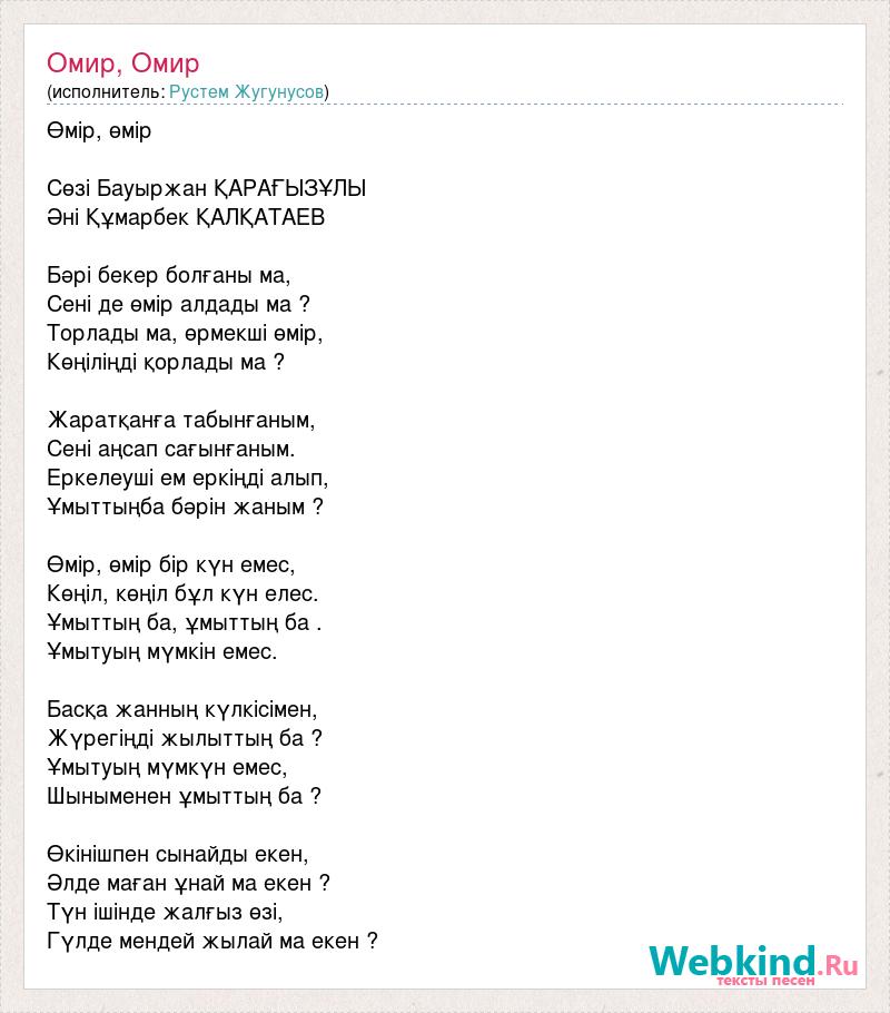 Өмір, өмір Сөзі Бауыржан ҚАРАҒЫЗҰЛЫ Әні Құмарбек ҚАЛҚАТАЕВ Бәрі бекер болғаны ма, Сені де өмір алдады ма ? Торлады ма, өрмекші өмір, Көңіліңді қорлады ма ? Жаратқанға табынғаным, Сені аңсап сағынғаным. Еркелеуші ем еркіңді алып, Ұмыттыңба бәрін жаным ? Өмір, өмір бір күн емес, Көңіл, көңіл бұл күн елес. Ұмыттың ба, ұмыттың ба . Ұмытуың мүмкін емес. Басқа жанның күлкісімен, Жүрегіңді жылыттың ба ? Ұмытуың мүмкүн емес, Шыныменен ұмыттың ба ? Өкінішпен сынайды екен, Әлде маған ұнай ма екен ? Түн ішінде жалғыз өзі, Гүлде мендей жылай ма екен ?