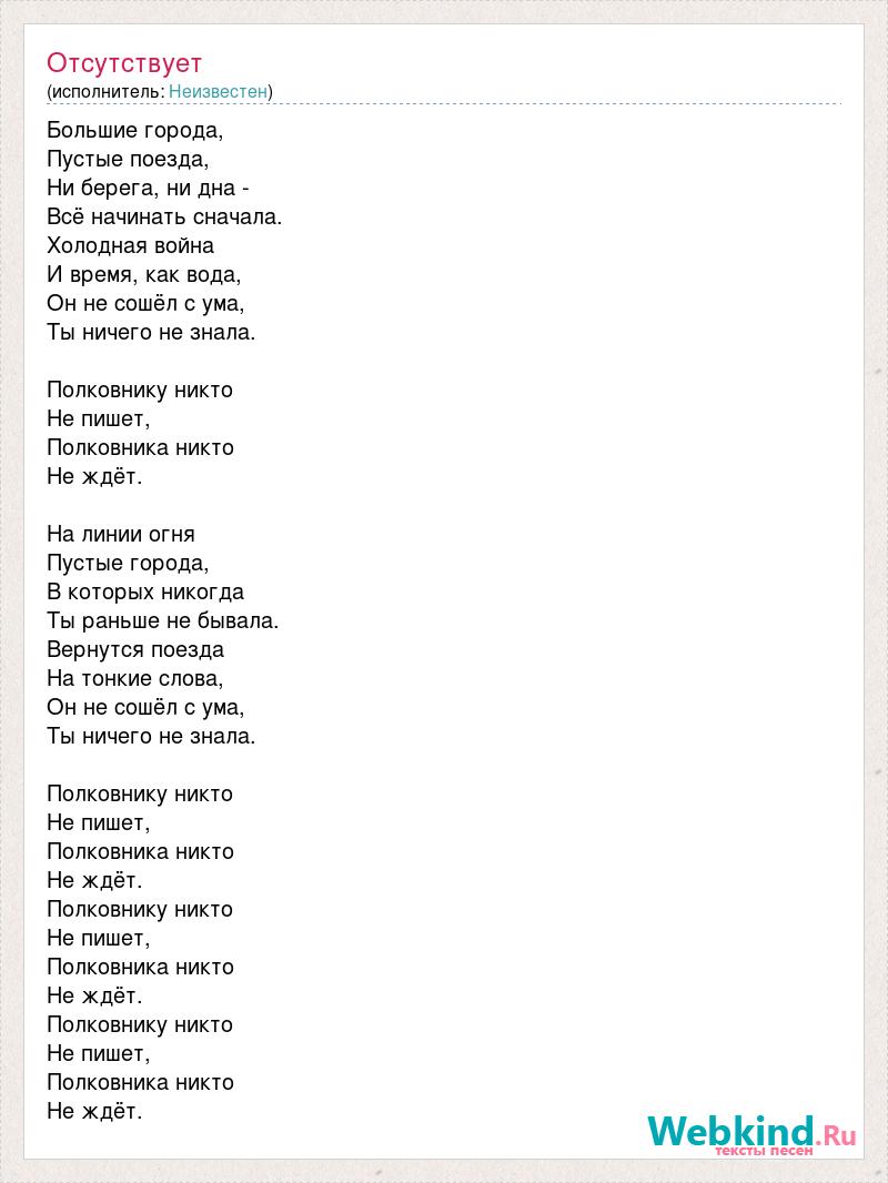Большие города, Пустые поезда, Ни берега, ни дна - Всё начинать сначала. Холодная война И время, как вода, Он не сошёл с ума, Ты ничего не знала. Полковнику никто Не пишет, Полковника никто Не ждёт. На линии огня Пустые города, В которых никогда Ты раньше не бывала. Вернутся поезда На тонкие слова, Он не сошёл с ума, Ты ничего не знала. Полковнику никто Не пишет, Полковника никто Не ждёт. Полковнику никто Не пишет, Полковника никто Не ждёт. Полковнику никто Не пишет, Полковника никто Не ждёт.