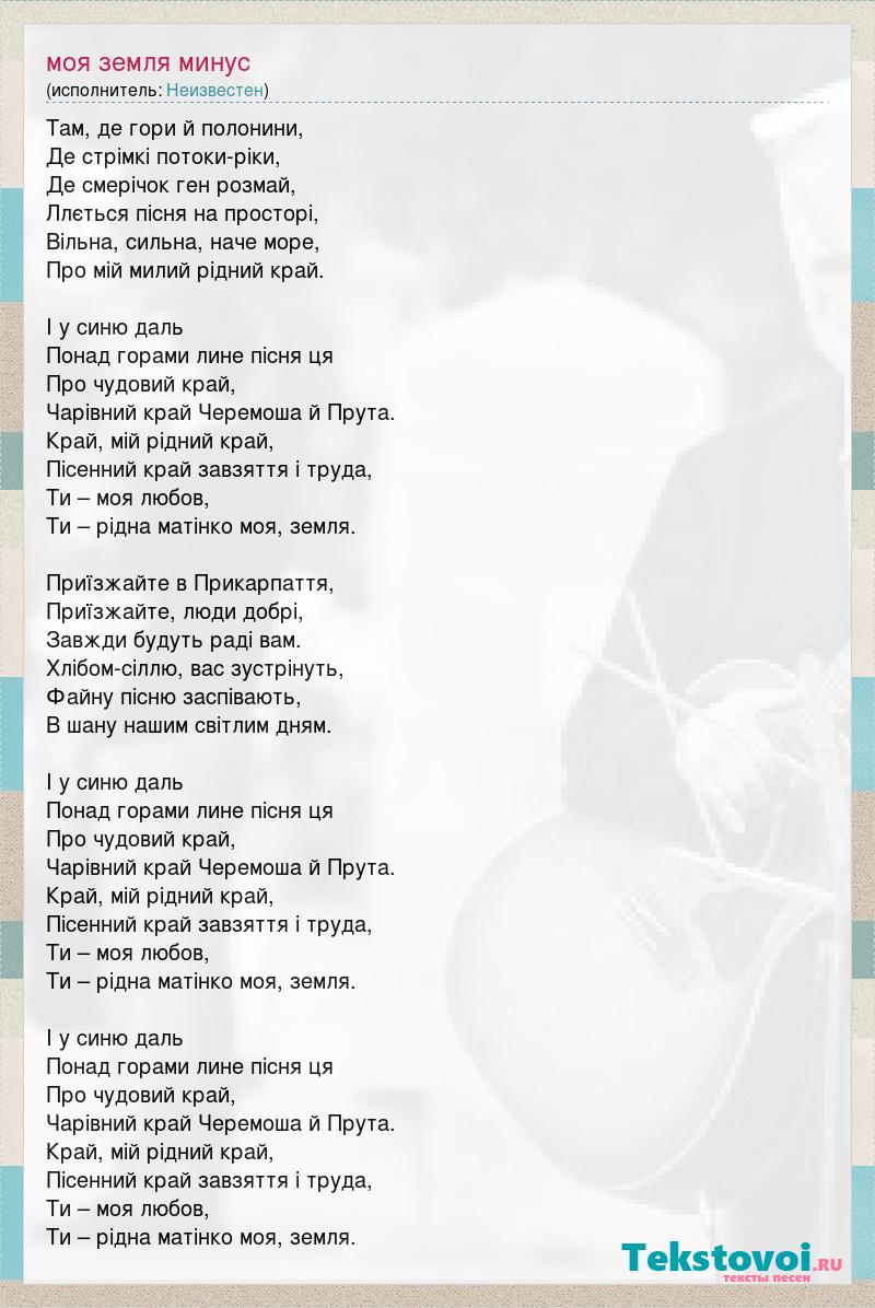 Там, де гори й полонини, Де стрiмкi потоки-рiки, Де смерiчок ген розмай, Ллється пiсня на просторi, Вiльна, сильна, наче море, Про мiй милий рiдний край. I у синю даль Понад горами лине пiсня ця Про чудовий край, Чарiвний край Черемоша й Прута. Край, мiй рiдний край, Пiсенний край завзяття i труда, Ти – моя любов, Ти – рiдна матiнко моя, земля. Приїзжайте в Прикарпаття, Приїзжайте, люди добрi, Завжди будуть радi вам. Хлiбом-сiллю, вас зустрiнуть, Файну пiсню заспiвають, В шану нашим свiтлим дням. I у синю даль Понад горами лине пiсня ця Про чудовий край, Чарiвний край Черемоша й Прута. Край, мiй рiдний край, Пiсенний край завзяття i труда, Ти – моя любов, Ти – рiдна матiнко моя, земля. I у синю даль Понад горами лине пiсня ця Про чудовий край, Чарiвний край Черемоша й Прута. Край, мiй рiдний край, Пiсенний край завзяття i труда, Ти – моя любов, Ти – рiдна матiнко моя, земля.