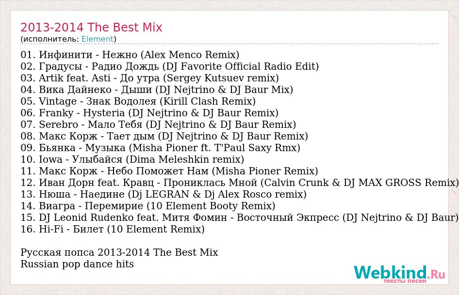 01. Инфинити - Нежно (Alex Menco Remix) 02. Градусы - Радио Дождь (DJ Favorite Official Radio Edit) 03. Artik feat. Asti - До утра (Sergey Kutsuev remix) 04. Вика Дайнеко - Дыши (DJ Nejtrino & DJ Baur Mix) 05. Vintage - Знак Водолея (Kirill Clash Remix) 06. Franky - Hysteria (DJ Nejtrino & DJ Baur Remix) 07. Serebro - Мало Тебя (DJ Nejtrino & DJ Baur Remix) 08. Макс Корж - Тает дым (DJ Nejtrino & DJ Baur Remix) 09. Бьянка - Музыка (Misha Pioner ft. T'Paul Saxy Rmx) 10. Iowa - Улыбайся (Dima Meleshkin remix) 11. Макс Корж - Небо Поможет Нам (Misha Pioner Remix) 12. Иван Дорн feat. Кравц - Прониклась Мной (Calvin Crunk & DJ MAX GROSS Remix) 13. Нюша - Наедине (Dj LEGRAN & Dj Alex Rosco remix) 14. Виагра - Перемирие (10 Element Booty Remix) 15. DJ Leonid Rudenko feat. Митя Фомин - Восточный Экпресс (DJ Nejtrino & DJ Baur) 16. Hi-Fi - Билет (10 Element Remix) Русская попса 2013-2014 The Best Mix Russian pop dance hits