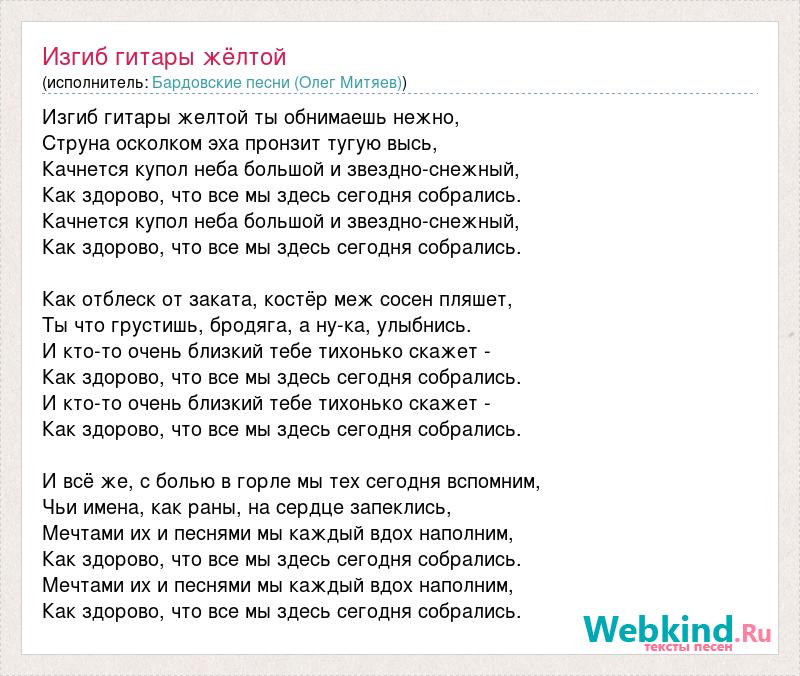 Изгиб гитары желтой ты обнимаешь нежно, Струна осколком эха пронзит тугую высь, Качнется купол неба большой и звездно-снежный, Как здорово, что все мы здесь сегодня собрались. Качнется купол неба большой и звездно-снежный, Как здорово, что все мы здесь сегодня собрались. Как отблеск от заката, костёр меж сосен пляшет, Ты что грустишь, бродяга, а ну-ка, улыбнись. И кто-то очень близкий тебе тихонько скажет - Как здорово, что все мы здесь сегодня собрались. И кто-то очень близкий тебе тихонько скажет - Как здорово, что все мы здесь сегодня собрались. И всё же, с болью в горле мы тех сегодня вспомним, Чьи имена, как раны, на сердце запеклись, Мечтами их и песнями мы каждый вдох наполним, Как здорово, что все мы здесь сегодня собрались. Мечтами их и песнями мы каждый вдох наполним, Как здорово, что все мы здесь сегодня собрались.