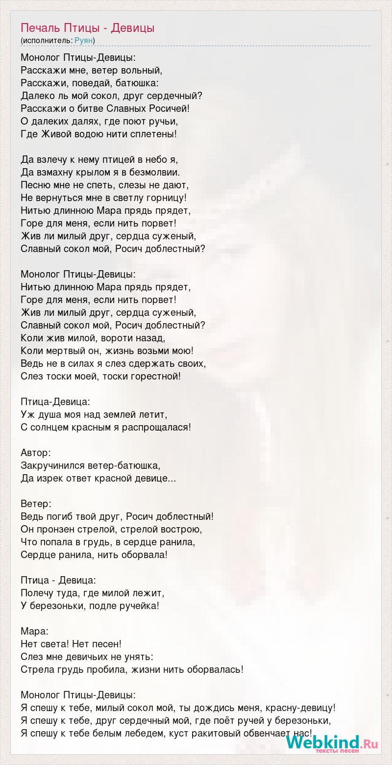 Монолог Птицы-Девицы: Расскажи мне, ветер вольный, Расскажи, поведай, батюшка: Далеко ль мой сокол, друг сердечный? Расскажи о битве Славных Росичей! О далеких далях, где поют ручьи, Где Живой водою нити сплетены! Да взлечу к нему птицей в небо я, Да взмахну крылом я в безмолвии. Песню мне не спеть, слезы не дают, Не вернуться мне в светлу горницу! Нитью длинною Мара прядь прядет, Горе для меня, если нить порвет! Жив ли милый друг, сердца суженый, Славный сокол мой, Росич доблестный? Монолог Птицы-Девицы: Нитью длинною Мара прядь прядет, Горе для меня, если нить порвет! Жив ли милый друг, сердца суженый, Славный сокол мой, Росич доблестный? Коли жив милой, вороти назад, Коли мертвый он, жизнь возьми мою! Ведь не в силах я слез сдержать своих, Слез тоски моей, тоски горестной! Птица-Девица: Уж душа моя над землей летит, С солнцем красным я распрощалася! Автор: Закручинился ветер-батюшка, Да изрек ответ красной девице... Ветер: Ведь погиб твой друг, Росич доблестный! Он пронзен стрелой, стрелой вострою, Что попала в грудь, в сердце ранила, Сердце ранила, нить оборвала! Птица - Девица: Полечу туда, где милой лежит, У березоньки, подле ручейка! Мара: Нет света! Нет песен! Слез мне девичьих не унять: Стрела грудь пробила, жизни нить оборвалась! Монолог Птицы-Девицы: Я спешу к тебе, милый сокол мой, ты дождись меня, красну-девицу! Я спешу к тебе, друг сердечный мой, где поёт ручей у березоньки, Я спешу к тебе белым лебедем, куст ракитовый обвенчает нас!