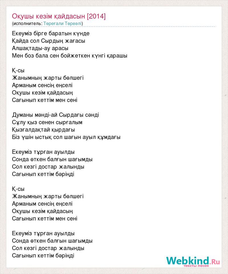 Екеуміз бірге баратын күнде Қайда сол Сырдың жағасы Алшақтады-ау арасы Мен боз бала сен бойжеткен күнгі қарашы Қ-сы Жанымның жарты бөлшегі Арманым сенсің еңселі Оқушы кезім қайдасың Сағынып кеттім мен сені Думаны мәнді-ай Сырдағы сәнді Сұлу қыз сенен сырғалым Қызғалдақтай қырдағы Біз үшін ыстық сол шағын ауыл құмдағы Екеуміз тұрған ауылды Сонда өткен балғын шағымды Сол кезгі достар жалынды Сағынып кеттім бәріңді Қ-сы Жанымның жарты бөлшегі Арманым сенсің еңселі Оқушы кезім қайдасың Сағынып кеттім мен сені Екеуміз тұрған ауылды Сонда өткен балғын шағымды Сол кезгі достар жалынды Сағынып кеттім бәріңді