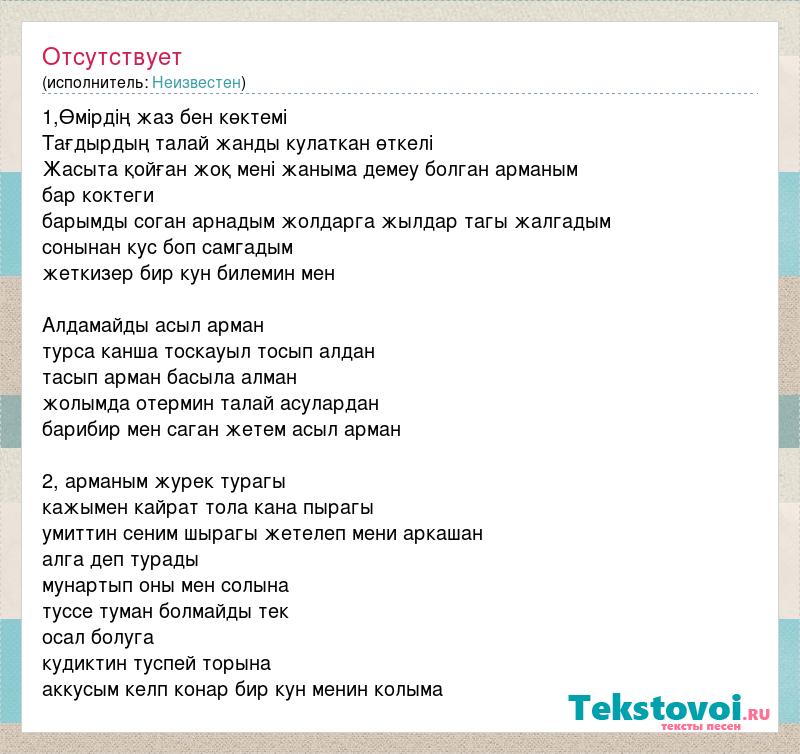 1,Өмірдің жаз бен көктемі Тағдырдың талай жанды кулаткан өткелі Жасыта қойған жоқ мені жаныма демеу болган арманым бар коктеги барымды соган арнадым жолдарга жылдар тагы жалгадым сонынан кус боп самгадым жеткизер бир кун билемин мен Алдамайды асыл арман турса канша тоскауыл тосып алдан тасып арман басыла алман жолымда отермин талай асулардан барибир мен саган жетем асыл арман 2, арманым журек турагы кажымен кайрат тола кана пырагы умиттин сеним шырагы жетелеп мени аркашан алга деп турады мунартып оны мен солына туссе туман болмайды тек осал болуга кудиктин туспей торына аккусым келп конар бир кун менин колыма