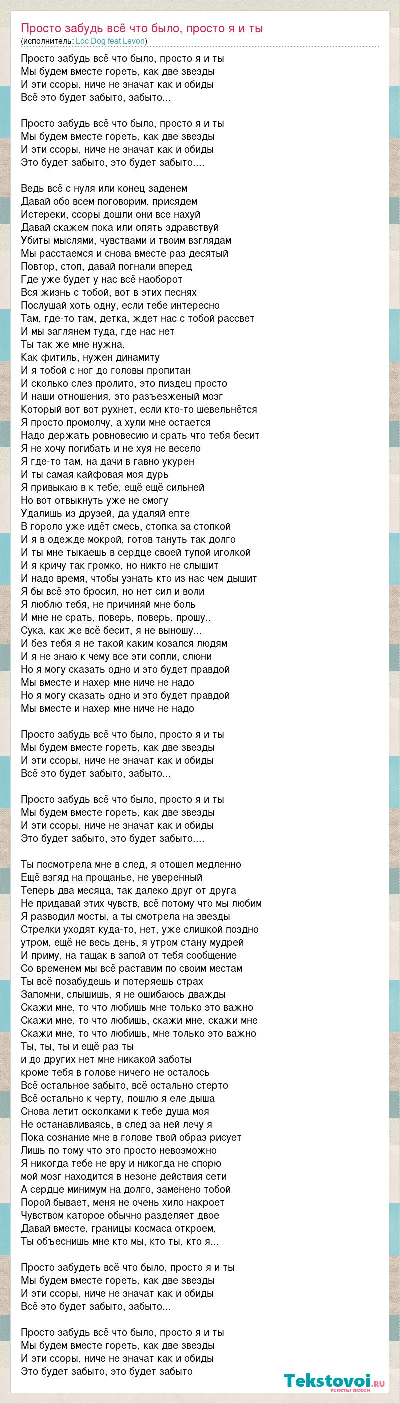 Просто забудь всё что было, просто я и ты Мы будем вместе гореть, как две звезды И эти ссоры, ниче не значат как и обиды Всё это будет забыто, забыто... Просто забудь всё что было, просто я и ты Мы будем вместе гореть, как две звезды И эти ссоры, ниче не значат как и обиды Это будет забыто, это будет забыто.... Ведь всё с нуля или конец заденем Давай обо всем поговорим, присядем Истереки, ссоры дошли они все нахуй Давай скажем пока или опять здравствуй Убиты мыслями, чувствами и твоим взглядам Мы расстаемся и снова вместе раз десятый Повтор, стоп, давай погнали вперед Где уже будет у нас всё наоборот Вся жизнь с тобой, вот в этих песнях Послушай хоть одну, если тебе интересно Там, где-то там, детка, ждет нас с тобой рассвет И мы заглянем туда, где нас нет Ты так же мне нужна, Как фитиль, нужен динамиту И я тобой с ног до головы пропитан И сколько слез пролито, это пиздец просто И наши отношения, это разъезженый мозг Который вот вот рухнет, если кто-то шевельнётся Я просто промолчу, а хули мне остается Надо держать ровновесию и срать что тебя бесит Я не хочу погибать и не хуя не весело Я где-то там, на дачи в гавно укурен И ты самая кайфовая моя дурь Я привыкаю в к тебе, ещё ещё сильней Но вот отвыкнуть уже не смогу Удалишь из друзей, да удаляй епте В гороло уже идёт смесь, стопка за стопкой И я в одежде мокрой, готов тануть так долго И ты мне тыкаешь в сердце своей тупой иголкой И я кричу так громко, но никто не слышит И надо время, чтобы узнать кто из нас чем дышит Я бы всё это бросил, но нет сил и воли Я люблю тебя, не причиняй мне боль И мне не срать, поверь, поверь, прошу.. Сука, как же всё бесит, я не выношу... И без тебя я не такой каким козался людям И я не знаю к чему все эти сопли, слюни Но я могу сказать одно и это будет правдой Мы вместе и нахер мне ниче не надо Но я могу сказать одно и это будет правдой Мы вместе и нахер мне ниче не надо Просто забудь всё что было, просто я и ты Мы будем вместе гореть, как две звезды И эти ссоры, ниче не значат как и обиды Всё это будет забыто, забыто... Просто забудь всё что было, просто я и ты Мы будем вместе гореть, как две звезды И эти ссоры, ниче не значат как и обиды Это будет забыто, это будет забыто.... Ты посмотрела мне в след, я отошел медленно Ещё взгяд на прощанье, не уверенный Теперь два месяца, так далеко друг от друга Не придавай этих чувств, всё потому что мы любим Я разводил мосты, а ты смотрела на звезды Стрелки уходят куда-то, нет, уже слишкой поздно утром, ещё не весь день, я утром стану мудрей И приму, на тащак в запой от тебя сообщение Со временем мы всё раставим по своим местам Ты всё позабудешь и потеряешь страх Запомни, слышишь, я не ошибаюсь дважды Скажи мне, то что любишь мне только это важно Скажи мне, то что любишь, скажи мне, скажи мне Скажи мне, то что любишь, мне только это важно Ты, ты, ты и ещё раз ты и до других нет мне никакой заботы кроме тебя в голове ничего не осталось Всё остальное забыто, всё остально стерто Всё остально к черту, пошлю я еле дыша Снова летит осколками к тебе душа моя Не останавливаясь, в след за ней лечу я Пока сознание мне в голове твой образ рисует Лишь по тому что это просто невозможно Я никогда тебе не вру и никогда не спорю мой мозг находится в незоне действия сети А сердце минимум на долго, заменено тобой Порой бывает, меня не очень хило накроет Чувством каторое обычно разделяет двое Давай вместе, г