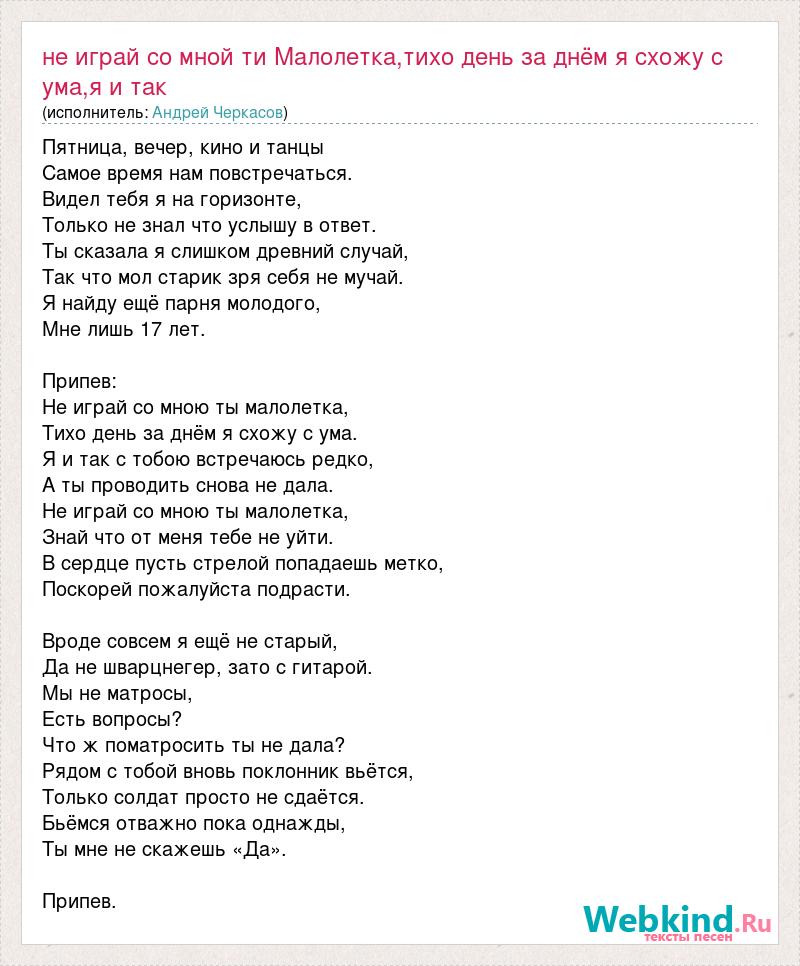 Главная→Исполнители→Андрей Черкасов→Не играй со мной ти Малолетка,тихо день за днём я схожу с ума,я и так