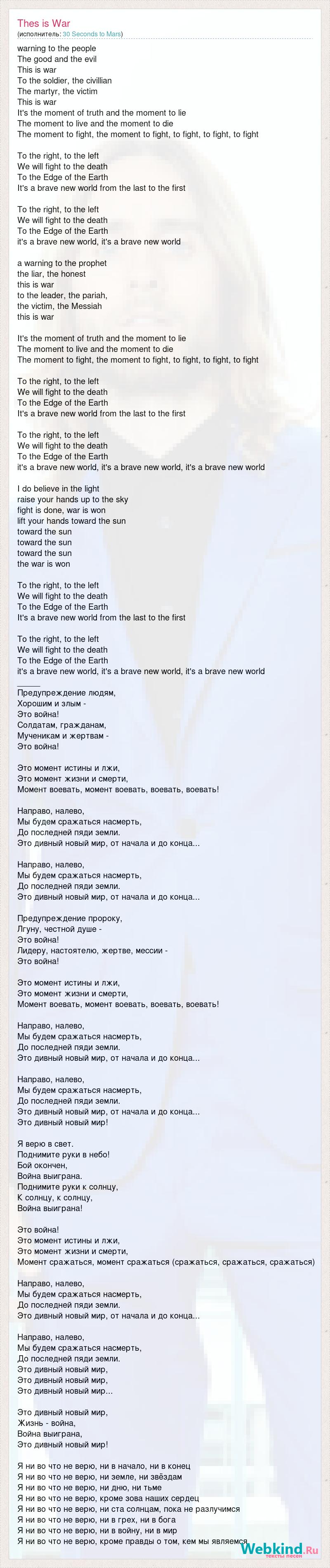 warning to the people The good and the evil This is war To the soldier, the civillian The martyr, the victim This is war It's the moment of truth and the moment to lie The moment to live and the moment to die The moment to fight, the moment to fight, to fight, to fight, to fight To the right, to the left We will fight to the death To the Edge of the Earth It's a brave new world from the last to the first To the right, to the left We will fight to the death To the Edge of the Earth it's a brave new world, it's a brave new world a warning to the prophet the liar, the honest this is war to the leader, the pariah, the victim, the Messiah this is war It's the moment of truth and the moment to lie The moment to live and the moment to die The moment to fight, the moment to fight, to fight, to fight, to fight To the right, to the left We will fight to the death To the Edge of the Earth It's a brave new world from the last to the first To the right, to the left We will fight to the death To the Edge of the Earth it's a brave new world, it's a brave new world, it's a brave new world I do believe in the light raise your hands up to the sky fight is done, war is won lift your hands toward the sun toward the sun toward the sun toward the sun the war is won To the right, to the left We will fight to the death To the Edge of the Earth It's a brave new world from the last to the first To the right, to the left We will fight to the death To the Edge of the Earth it's a brave new world, it's a brave new world, it's a brave new world _____ Предупреждение людям, Хорошим и злым - Это война! Солдатам, гражданам, Мученикам и жертвам - Это война! Это момент истины и лжи, Это момент жизни и смерти, Момент воевать, момент воевать, воевать, воевать! Направо, налево, Мы будем сражаться насмерть, До последней пяди земли. Это дивный новый мир, от начала и до конца... Направо, налево, Мы будем сражаться насмерть, До последней пяди земли. Это дивный новый мир, от начала и до конца... Предупреждение пророку, Лгуну, честной душе - Это война! Лидеру, настоятелю, жертве, мессии - Это война! Это момент истины и лжи, Это момент жизни и смерти, Момент воевать, момент воевать, воевать, воевать! Направо, налево, Мы будем сражаться насмерть, До последней пяди земли. Это дивный новый мир, от начала и до конца... Направо, налево, Мы будем сражаться насмерть, До последней пяди земли. Это дивный новый мир, от начала и до конца... Это дивный новый мир! Я верю в свет. Поднимите руки в небо! Бой окончен, Война выиграна. Поднимите руки к солнцу, К солнцу, к солнцу, Война выиграна! Это война! Это момент истины и лжи, Это момент жизни и смерти, Момент сражаться, момент сражаться (сражаться, сражаться, сражаться) Направо, налево, Мы будем сражаться насмерть, До последней пяди земли. Это дивный новый мир, от начала и до конца... Направо, налево, Мы будем сражаться насмерть, До последней пяди земли. Это дивный новый мир, Это дивный новый мир, Это дивный новый мир... Это дивный новый мир, Жизнь - война, Война выиграна, Это дивный новый мир! Я ни во что не верю, ни в начало, ни в конец Я ни во что не верю, ни земле, ни звёздам Я ни во что не верю, ни дню, ни тьме Я ни во что не верю, кроме зова наших сердец Я ни во что не верю, ни ста солнцам, пока не разлучимся Я ни во что не верю, ни в грех, ни в бога Я ни во что не верю, ни в войну, ни в мир Я ни во что не верю, кроме правды о том, кем мы являемся.