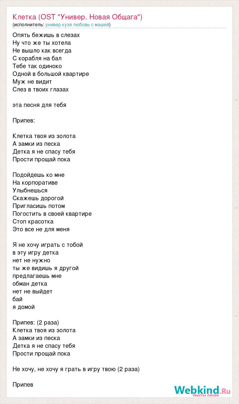 Опять бежишь в слезах Ну что же ты хотела Не вышло как всегда С корабля на бал Тебе так одиноко Одной в большой квартире Муж не видит Слез в твоих глазах эта песня для тебя Припев: Клетка твоя из золота А замки из песка Детка я не спасу тебя Прости прощай пока Подойдешь ко мне На корпоративе Улыбнешься Скажешь дорогой Пригласишь потом Погостить в своей квартире Стоп красотка Это все не для меня Я не хочу играть с тобой в эту игру детка нет не нужно ты же видишь я другой предлагаешь мне обман детка нет не выйдет бай я домой Припев: (2 раза) Клетка твоя из золота А замки из песка Детка я не спасу тебя Прости прощай пока Не хочу, не хочу я грать в игру твою (2 раза) Припев