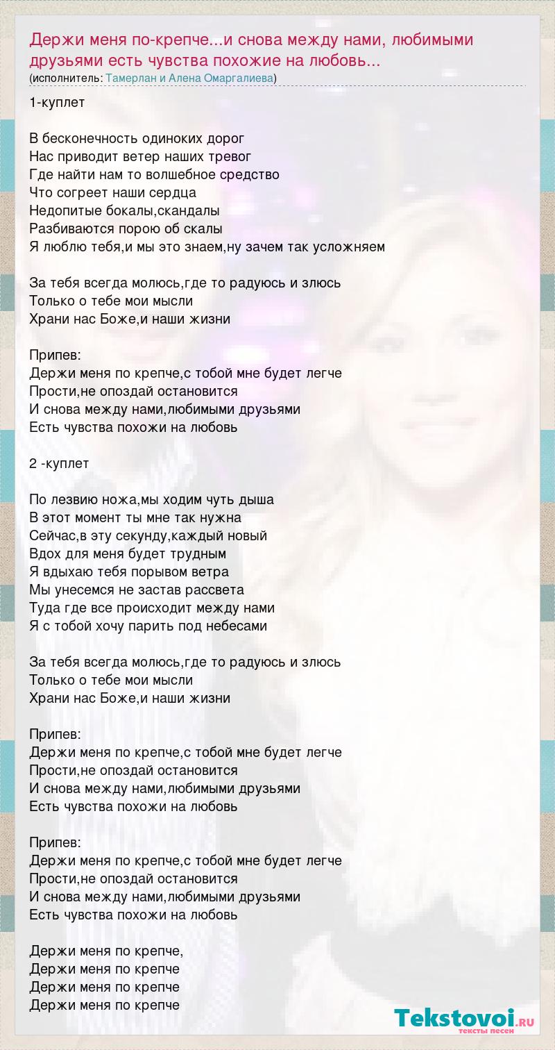 1-куплет В бесконечность одиноких дорог Нас приводит ветер наших тревог Где найти нам то волшебное средство Что согреет наши сердца Недопитые бокалы,скандалы Разбиваются порою об скалы Я люблю тебя,и мы это знаем,ну зачем так усложняем За тебя всегда молюсь,где то радуюсь и злюсь Только о тебе мои мысли Храни нас Боже,и наши жизни Припев: Держи меня по крепче,с тобой мне будет легче Прости,не опоздай остановится И снова между нами,любимыми друзьями Есть чувства похожи на любовь 2 -куплет По лезвию ножа,мы ходим чуть дыша В этот момент ты мне так нужна Сейчас,в эту секунду,каждый новый Вдох для меня будет трудным Я вдыхаю тебя порывом ветра Мы унесемся не застав рассвета Туда где все происходит между нами Я с тобой хочу парить под небесами За тебя всегда молюсь,где то радуюсь и злюсь Только о тебе мои мысли Храни нас Боже,и наши жизни Припев: Держи меня по крепче,с тобой мне будет легче Прости,не опоздай остановится И снова между нами,любимыми друзьями Есть чувства похожи на любовь Припев: Держи меня по крепче,с тобой мне будет легче Прости,не опоздай остановится И снова между нами,любимыми друзьями Есть чувства похожи на любовь Держи меня по крепче, Держи меня по крепче Держи меня по крепче Держи меня по крепче