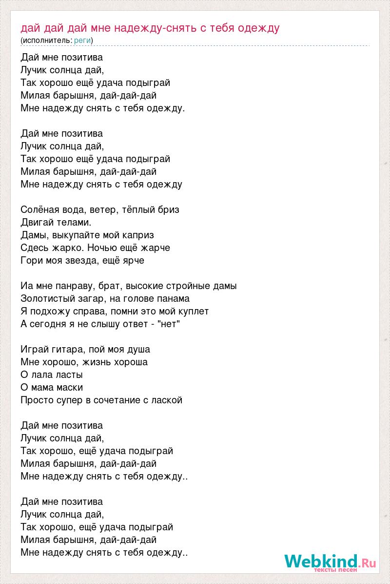 Дай мне позитива Лучик солнца дай, Так хорошо ещё удача подыграй Милая барышня, дай-дай-дай Мне надежду снять с тебя одежду. Дай мне позитива Лучик солнца дай, Так хорошо ещё удача подыграй Милая барышня, дай-дай-дай Мне надежду снять с тебя одежду Солёная вода, ветер, тёплый бриз Двигай телами. Дамы, выкупайте мой каприз Сдесь жарко. Ночью ещё жарче Гори моя звезда, ещё ярче Иa мне панраву, брат, высокие стройные дамы Золотистый загар, на голове панама Я подхожу справа, помни это мой куплет А сегодня я не слышу ответ - "нет" Играй гитара, пой моя душа Мне хорошо, жизнь хороша О лала ласты О мама маски Просто супер в сочетание с лаской Дай мне позитива Лучик солнца дай, Так хорошо, ещё удача подыграй Милая барышня, дай-дай-дай Мне надежду снять с тебя одежду.. Дай мне позитива Лучик солнца дай, Так хорошо, ещё удача подыграй Милая барышня, дай-дай-дай Мне надежду снять с тебя одежду..