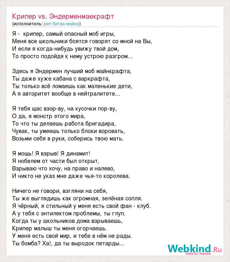 Я - крипер, самый опасный моб игры, Меня все школьники боятся говорят со мной на Вы, И если я когда-нибудь увижу твой дом, То просто подойдя к нему устрою разгром... Здесь я Эндермен лучший моб майнкрафта, Ты даже хуже кабана с варкрафта, Ты только всё ломаешь как маленькие дети, А я авторитет вообще в нейтралитете... Я тебя щас взор-ву, на кусочки пор-ву, О да, я монстр этого мира, То что ты делаешь работа бригадира, Чувак, ты умеешь только блоки воровать, Возьми себя в руки, соберись твою мать. Я мощь! Я взрыв! Я динамит! Я нобелем от части был открыт, Взрываю что хочу, на право и налево, И никто не указ мне даже чья-то королева. Ничего не говори, взгляни на себя, Ты же выглядишь как огромная, зелёная сопля. Я чёрный, я стильный у меня есть свой фан - клуб. А у тебя с энтилектом проблемы, ты глуп. Когда ты у школьников дома взрываешь, Крипер малыш ты меня огорчаешь. У меня есть свой мир, и тебе в нём не рады. Ты бомба? Ха!, да ты выродок петарды...