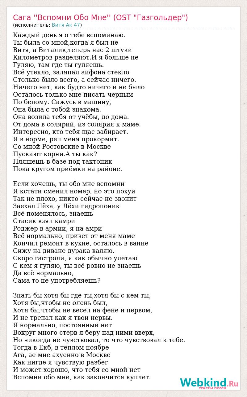 Каждый день я о тебе вспоминаю. Ты была со мной,когда я был не Витя, а Виталик,теперь нас 2 штуки Километров разделяют.И я больше не Гуляю, там где ты гуляешь. Всё утекло, заляпал айфона стекло Столько было всего, а сейчас ничего. Ничего нет, как будто ничего и не было Осталось только мне писать чёрным По белому. Сажусь в машину, Она была с тобой знакома. Она возила тебя от учёбы, до дома. От дома в солярий, из солярия к маме. Интересно, кто тебя щас забирает. Я в норме, реп меня прокормит. Со мной Ростовские в Москве Пускают корни.А ты как? Пляшешь в базе под тактоник Пока кругом приёмки на районе. Если хочешь, ты обо мне вспомни Я кстати сменил номер, но это похуй Так не плохо, никто сейчас не звонит Заехал Лёха, у Лёхи гидропоник Всё поменялось, знаешь Стасик взял камри Роджер в армии, я на амри Всё нормально, привет от меня маме Кончил ремонт в кухне, осталось в ванне Сижу на диване дурака валяю. Скоро гастроли, я как обычно улетаю С кем я гуляю, ты всё ровно не знаешь Да всё нормально, Сама то не употребляешь? Знать бы хотя бы где ты,хотя бы с кем ты, Хотя бы,чтобы не олень был, Хотя бы,чтобы не весел на фене и первом, И не трепал как я твои нервы. Я нормально, постоянный нет Вокруг много стерв я беру над ними вверх, Но никогда не чувствовал, то что чувствовал к тебе. Тогда в Екб, в тёплом ноябре Ага, ае мне ахуенно в Москве Как нигде я чувствую разбег И может хорошо, что тебя со мной нет Вспомни обо мне, как закончится куплет.