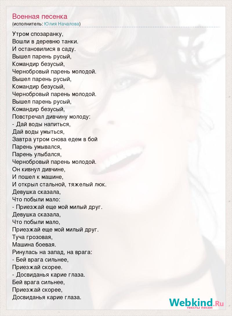 Утром спозаранку, Вошли в деревню танки. И остановилися в саду. Вышел парень русый, Командир безусый, Чернобровый парень молодой. Вышел парень русый, Командир безусый, Чернобровый парень молодой. Вышел парень русый, Командир безусый, Повстречал дивчину молоду: - Дай воды напиться, Дай воды умыться, Завтра утром снова едем в бой Парень умывался, Парень улыбался, Чернобровый парень молодой. Он кивнул дивчине, И пошел к машине, И открыл стальной, тяжелый люк. Девушка сказала, Что побыли мало: - Приезжай еще мой милый друг. Девушка сказала, Что побыли мало, Приезжай еще мой милый друг. Туча грозовая, Машина боевая. Ринулась на запад, на врага: - Бей врага сильнее, Приезжай скорее. - Досвиданья карие глаза. Бей врага сильнее, Приезжай скорее, Досвиданья карие глаза.