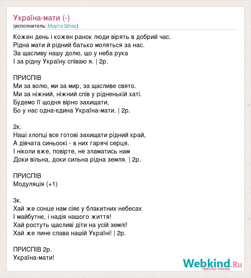 Кожен день і кожен ранок люди вірять в добрий час. Рідна мати й рідний батько моляться за нас. За щасливу нашу долю, що у неба рука І за рідну Україну співаю я. | 2р. ПРИСПІВ Ми за волю, ми за мир, за щасливе свято. Ми за ніжний, ніжний спів у рідненькій хаті. Будемо її щодня вірно захищати, Бо у нас одна-єдина Україна-мати. | 2р. 2к. Наші хлопці все готові захищати рідний край, А дівчата синьоокі - в них гарячі серця. І ніколи вже, повірте, не зламатись нам Доки вільна, доки сильна рідна земля. | 2р. ПРИСПІВ Модуляція (+1) 3к. Хай же сонце нам сіяє у блакитних небесах І майбутнє, і надія нашого життя! Хай ростуть щасливі діти на усій землі! Хай же лине слава нашій Україні! | 2р. ПРИСПІВ 2р. Україна-мати!
