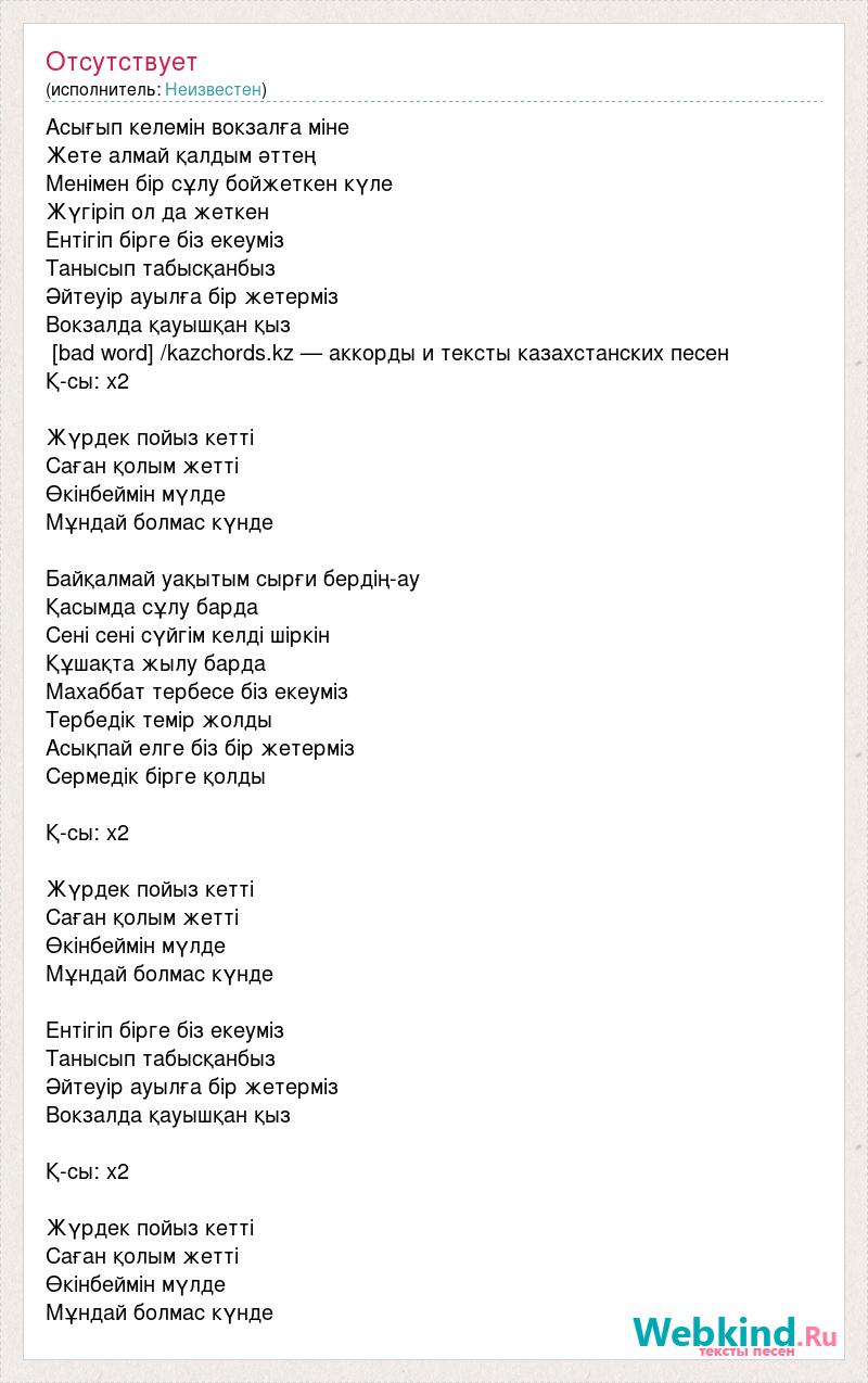 Асығып келемін вокзалға міне Жете алмай қалдым әттең Менімен бір сұлу бойжеткен күле Жүгіріп ол да жеткен Ентігіп бірге біз екеуміз Танысып табысқанбыз Әйтеуір ауылға бір жетерміз Вокзалда қауышқан қыз [bad word] /kazchords.kz — аккорды и тексты казахстанских песен Қ-сы: х2 Жүрдек пойыз кетті Саған қолым жетті Өкінбеймін мүлде Мұндай болмас күнде Байқалмай уақытым сырғи бердің-ау Қасымда сұлу барда Сені сені сүйгім келді шіркін Құшақта жылу барда Махаббат тербесе біз екеуміз Тербедік темір жолды Асықпай елге біз бір жетерміз Сермедік бірге қолды Қ-сы: х2 Жүрдек пойыз кетті Саған қолым жетті Өкінбеймін мүлде Мұндай болмас күнде Ентігіп бірге біз екеуміз Танысып табысқанбыз Әйтеуір ауылға бір жетерміз Вокзалда қауышқан қыз Қ-сы: х2 Жүрдек пойыз кетті Саған қолым жетті Өкінбеймін мүлде Мұндай болмас күнде