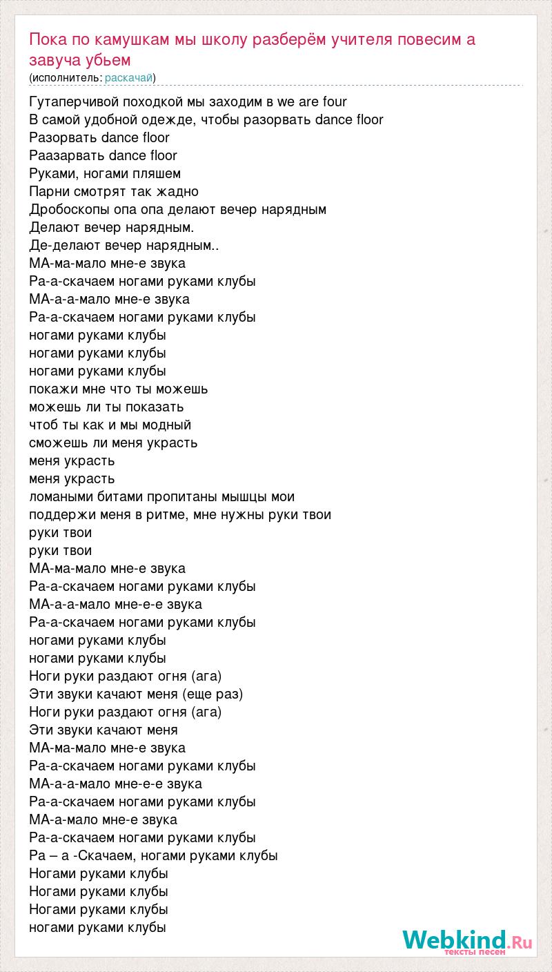 Гутаперчивой походкой мы заходим в we are four В самой удобной одежде, чтобы разорвать dance floor Разорвать dance floor Раазарвать dance floor Руками, ногами пляшем Парни смотрят так жадно Дробоскопы опа опа делают вечер нарядным Делают вечер нарядным. Де-делают вечер нарядным.. МА-ма-мало мне-е звука Ра-а-скачаем ногами руками клубы МА-а-а-мало мне-е звука Ра-а-скачаем ногами руками клубы ногами руками клубы ногами руками клубы ногами руками клубы покажи мне что ты можешь можешь ли ты показать чтоб ты как и мы модный сможешь ли меня украсть меня украсть меня украсть ломаными битами пропитаны мышцы мои поддержи меня в ритме, мне нужны руки твои руки твои руки твои МА-ма-мало мне-е звука Ра-а-скачаем ногами руками клубы МА-а-а-мало мне-е-е звука Ра-а-скачаем ногами руками клубы ногами руками клубы ногами руками клубы Ноги руки раздают огня (ага) Эти звуки качают меня (еще раз) Ноги руки раздают огня (ага) Эти звуки качают меня МА-ма-мало мне-е звука Ра-а-скачаем ногами руками клубы МА-а-а-мало мне-е-е звука Ра-а-скачаем ногами руками клубы МА-а-мало мне-е звука Ра-а-скачаем ногами руками клубы Ра – а -Скачаем, ногами руками клубы Ногами руками клубы Ногами руками клубы Ногами руками клубы ногами руками клубы