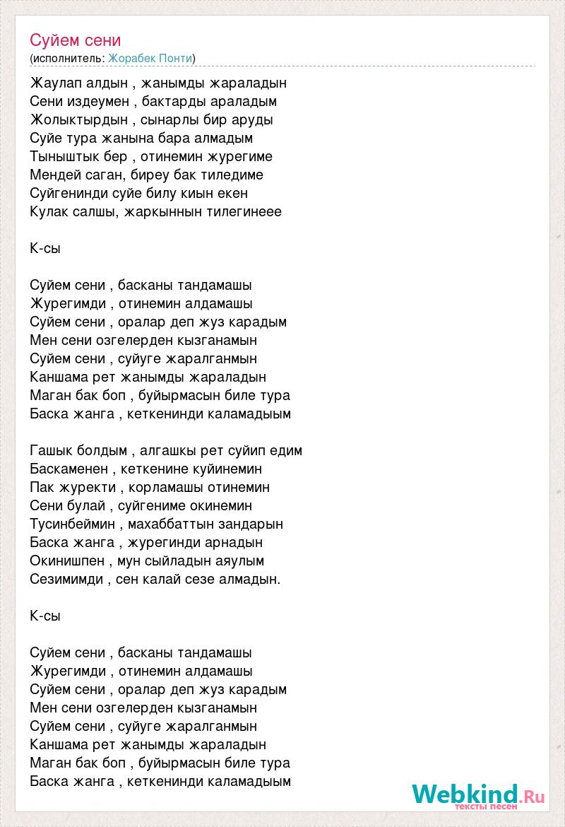Жаулап алдын , жанымды жараладын Сени издеумен , бактарды араладым Жолыктырдын , сынарлы бир аруды Суйе тура жанына бара алмадым Тыныштык бер , отинемин журегиме Мендей саган, биреу бак тиледиме Суйгенинди суйе билу киын екен Кулак салшы, жаркыннын тилегинеее К-сы Суйем сени , басканы тандамашы Журегимди , отинемин алдамашы Суйем сени , оралар деп жуз карадым Мен сени озгелерден кызганамын Суйем сени , суйуге жаралганмын Каншама рет жанымды жараладын Маган бак боп , буйырмасын биле тура Баска жанга , кеткенинди каламадыым Гашык болдым , алгашкы рет суйип едим Баскаменен , кеткенине куйинемин Пак журекти , корламашы отинемин Сени булай , суйгениме окинемин Тусинбеймин , махаббаттын зандарын Баска жанга , журегинди арнадын Окинишпен , мун сыйладын аяулым Сезимимди , сен калай сезе алмадын. К-сы Суйем сени , басканы тандамашы Журегимди , отинемин алдамашы Суйем сени , оралар деп жуз карадым Мен сени озгелерден кызганамын Суйем сени , суйуге жаралганмын Каншама рет жанымды жараладын Маган бак боп , буйырмасын биле тура Баска жанга , кеткенинди каламадыым
