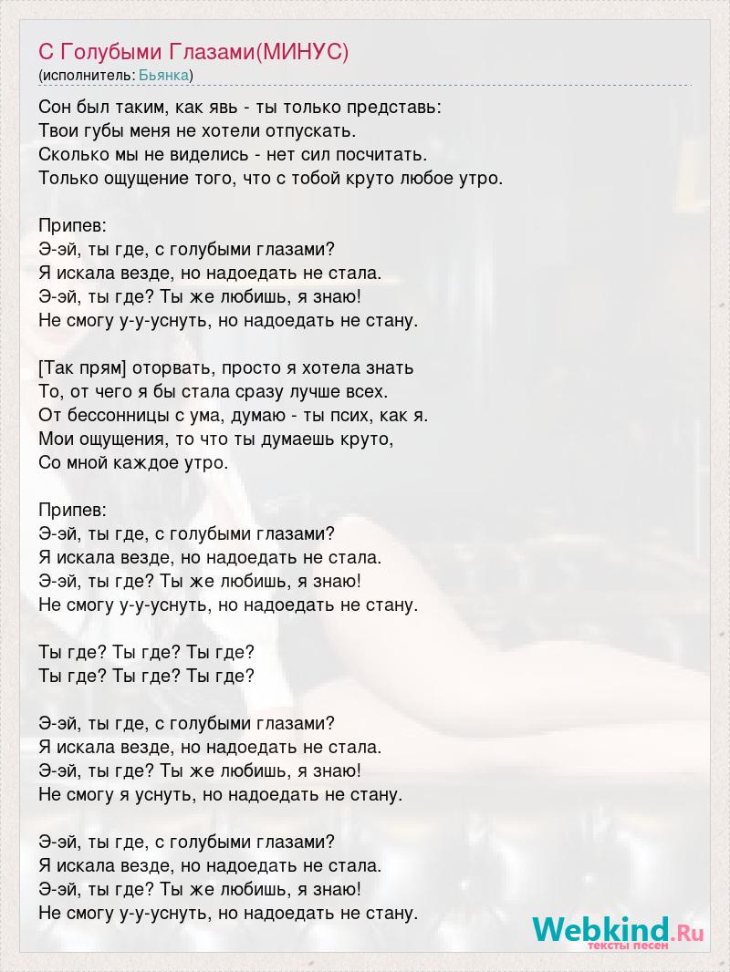 Сон был таким, как явь - ты только представь: Твои губы меня не хотели отпускать. Сколько мы не виделись - нет сил посчитать. Только ощущение того, что с тобой круто любое утро. Припев: Э-эй, ты где, с голубыми глазами? Я искала везде, но надоедать не стала. Э-эй, ты где? Ты же любишь, я знаю! Не смогу у-у-уснуть, но надоедать не стану. [Так прям] оторвать, просто я хотела знать То, от чего я бы стала сразу лучше всех. От бессонницы с ума, думаю - ты псих, как я. Мои ощущения, то что ты думаешь круто, Со мной каждое утро. Припев: Э-эй, ты где, с голубыми глазами? Я искала везде, но надоедать не стала. Э-эй, ты где? Ты же любишь, я знаю! Не смогу у-у-уснуть, но надоедать не стану. Ты где? Ты где? Ты где? Ты где? Ты где? Ты где? Э-эй, ты где, с голубыми глазами? Я искала везде, но надоедать не стала. Э-эй, ты где? Ты же любишь, я знаю! Не смогу я уснуть, но надоедать не стану. Э-эй, ты где, с голубыми глазами? Я искала везде, но надоедать не стала. Э-эй, ты где? Ты же любишь, я знаю! Не смогу у-у-уснуть, но надоедать не стану.