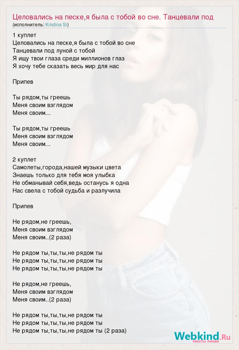 1 куплет Целовались на песке,я была с тобой во сне Танцевали под луной с тобой Я ищу твои глаза среди миллионов глаз Я хочу тебе сказать весь мир для нас Припев Ты рядом,ты греешь Меня своим взглядом Меня своим... Ты рядом,ты греешь Меня своим взглядом Меня своим... 2 куплет Самолеты,города,нашей музыки цвета Знаешь только для тебя моя улыбка Не обманывай себя,ведь останусь я одна Нас свела с тобой судьба и разлучила Припев Не рядом,не греешь, Меня своим взглядом Меня своим..(2 раза) Не рядом ты,ты,ты,не рядом ты Не рядом ты,ты,ты,не рядом ты Не рядом ты,ты,ты,не рядом ты Не рядом,не греешь, Меня своим взглядом Меня своим..(2 раза) Не рядом ты,ты,ты,не рядом ты Не рядом ты,ты,ты,не рядом ты Не рядом ты,ты,ты,не рядом ты (2 раза)