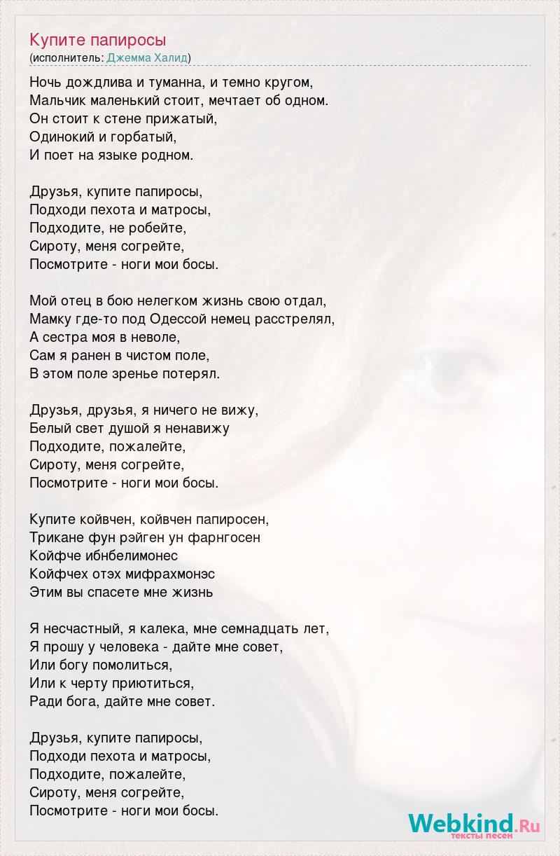 Ночь дождлива и туманна, и темно кругом, Мальчик маленький стоит, мечтает об одном. Он стоит к стене прижатый, Одинокий и горбатый, И поет на языке родном. Друзья, купите папиросы, Подходи пехота и матросы, Подходите, не робейте, Сироту, меня согрейте, Посмотрите - ноги мои босы. Мой отец в бою нелегком жизнь свою отдал, Мамку где-то под Одессой немец расстрелял, А сестра моя в неволе, Сам я ранен в чистом поле, В этом поле зренье потерял. Друзья, друзья, я ничего не вижу, Белый свет душой я ненавижу Подходите, пожалейте, Сироту, меня согрейте, Посмотрите - ноги мои босы. Купите койвчен, койвчен папиросен, Трикане фун рэйген ун фарнгосен Койфче ибнбелимонес Койфчех отэх мифрахмонэс Этим вы спасете мне жизнь Я несчастный, я калека, мне семнадцать лет, Я прошу у человека - дайте мне совет, Или богу помолиться, Или к черту приютиться, Ради бога, дайте мне совет. Друзья, купите папиросы, Подходи пехота и матросы, Подходите, пожалейте, Сироту, меня согрейте, Посмотрите - ноги мои босы.