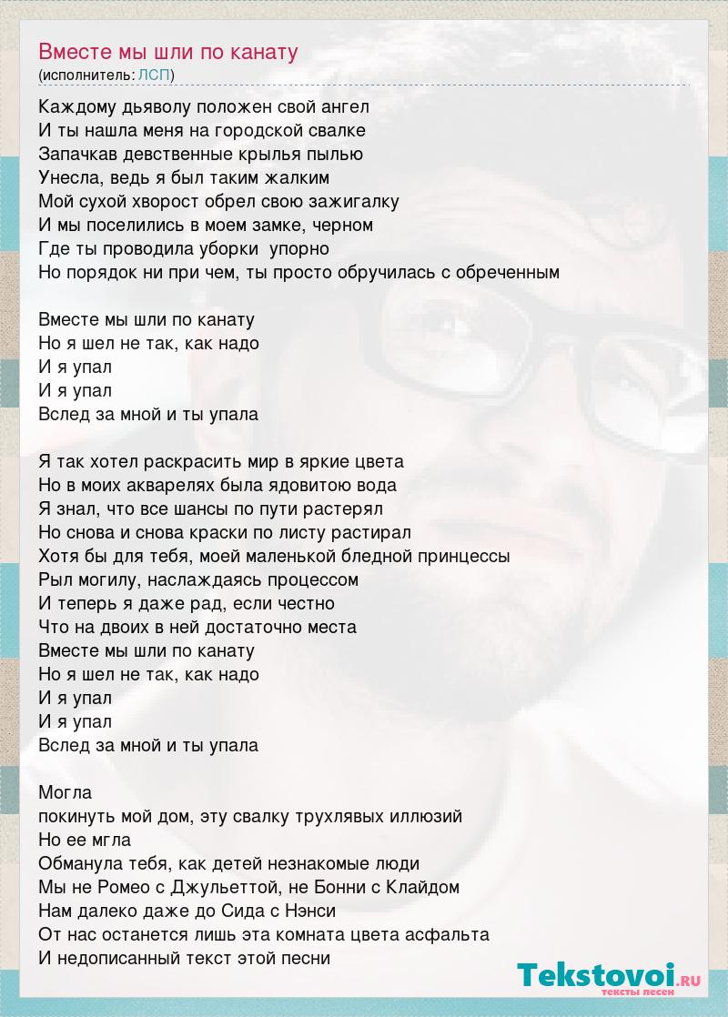 Каждому дьяволу положен свой ангел И ты нашла меня на городской свалке Запачкав девственные крылья пылью Унесла, ведь я был таким жалким Мой сухой хворост обрел свою зажигалку И мы поселились в моем замке, черном Где ты проводила уборки упорно Но порядок ни при чем, ты просто обручилась с обреченным Вместе мы шли по канату Но я шел не так, как надо И я упал И я упал Вслед за мной и ты упала Я так хотел раскрасить мир в яркие цвета Но в моих акварелях была ядовитою вода Я знал, что все шансы по пути растерял Но снова и снова краски по листу растирал Хотя бы для тебя, моей маленькой бледной принцессы Рыл могилу, наслаждаясь процессом И теперь я даже рад, если честно Что на двоих в ней достаточно места Вместе мы шли по канату Но я шел не так, как надо И я упал И я упал Вслед за мной и ты упала Могла покинуть мой дом, эту свалку трухлявых иллюзий Но ее мгла Обманула тебя, как детей незнакомые люди Мы не Ромео с Джульеттой, не Бонни с Клайдом Нам далеко даже до Сида с Нэнси От нас останется лишь эта комната цвета асфальта И недописанный текст этой песни