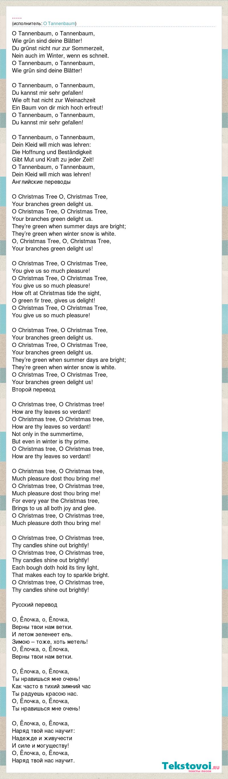 O Tannenbaum, o Tannenbaum, Wie grün sind deine Blätter! Du grünst nicht nur zur Sommerzeit, Nein auch im Winter, wenn es schneit. O Tannenbaum, o Tannenbaum, Wie grün sind deine Blätter! O Tannenbaum, o Tannenbaum, Du kannst mir sehr gefallen! Wie oft hat nicht zur Weinachzeit Ein Baum von dir mich hoch erfreut! O Tannenbaum, o Tannenbaum, Du kannst mir sehr gefallen! O Tannenbaum, o Tannenbaum, Dein Kleid will mich was lehren: Die Hoffnung und Beständigkeit Gibt Mut und Kraft zu jeder Zeit! O Tannenbaum, o Tannenbaum, Dein Kleid will mich was lehren! Английские переводы O Christmas Tree O, Christmas Tree, Your branches green delight us. O Christmas Tree, O Christmas Tree, Your branches green delight us. They’re green when summer days are bright; They’re green when winter snow is white. O, Christmas Tree, O, Christmas Tree, Your branches green delight us! O Christmas Tree, O Christmas Tree, You give us so much pleasure! O Christmas Tree, O Christmas Tree, You give us so much pleasure! How oft at Christmas tide the sight, O green fir tree, gives us delight! O Christmas Tree, O Christmas Tree, You give us so much pleasure! O Christmas Tree, O Christmas Tree, Your branches green delight us. O Christmas Tree, O Christmas Tree, Your branches green delight us. They’re green when summer days are bright; They’re green when winter snow is white. O Christmas Tree, O Christmas Tree, Your branches green delight us! Второй перевод O Christmas tree, O Christmas tree! How are thy leaves so verdant! O Christmas tree, O Christmas tree, How are thy leaves so verdant! Not only in the summertime, But even in winter is thy prime. O Christmas tree, O Christmas tree, How are thy leaves so verdant! O Christmas tree, O Christmas tree, Much pleasure dost thou bring me! O Christmas tree, O Christmas tree, Much pleasure dost thou bring me! For every year the Christmas tree, Brings to us all both joy and glee. O Christmas tree, O Christmas tree, Much pleasure doth thou bring me! O Christmas tree, O Christmas tree, Thy candles shine out brightly! O Christmas tree, O Christmas tree, Thy candles shine out brightly! Each bough doth hold its tiny light, That makes each toy to sparkle bright. O Christmas tree, O Christmas tree, Thy candles shine out brightly! Русский перевод О, Ёлочка, о, Ёлочка, Верны твои нам ветки. И летом зеленеет ель. Зимою – тоже, хоть метель! О, Ёлочка, о, Ёлочка, Верны твои нам ветки. О, Ёлочка, о, Ёлочка, Ты нравишься мне очень! Как часто в тихий зимний час Ты радуешь красою нас. О, Ёлочка, о, Ёлочка, Ты нравишься мне очень! О, Ёлочка, о, Ёлочка, Наряд твой нас научит: Надежде и живучести И силе и могуществу! О, Ёлочка, о, Ёлочка, Наряд твой нас научит.