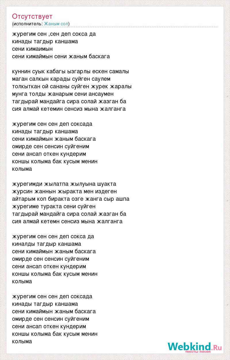 журегим сен ,сен деп сокса да кинады тагдыр каншама сени кимаимын сени кимаймын сени жаным баскага куннин суык кабагы ызгарлы ескен самалы маган салкын карады суйген саулем толкыткан ой сананы суйген журек жаралы мунга толды жанарым сени ансаумен тагдырай мандайга сира солай жазган ба сия алмай кетемин сенсиз мына жалганга журегим сен сен деп соксада кинады тагдыр каншама сени кимаймын жаным баскага омирде сен сенсин суйгеним сени ансап откен кундерим коншы колыма бак кусым менин колыма журегимди жылатпа жылуына шуакта журсин жаннын жыракта мен издеген айтарым коп биракта озге жанга сыр ашпа журегиме туракта сени суйген тагдырай мандайга сира солай жазган ба сия алмай кетемн сенсиз мына жалганга журегим сен сен деп сокса да киналды тагдыр каншама сени кимаймын жаным баскага омирде сен сенсин суйгеним сени ансап откен кундерим коншы колыма бак кусым менин колыма журегим сен сен деп соксада кинады тагдыр каншама сени кимаймын жаным баскага омирде сен сенсин суйгеним сени ансап откен кундерим коншы колыма бак кусым менин колыма