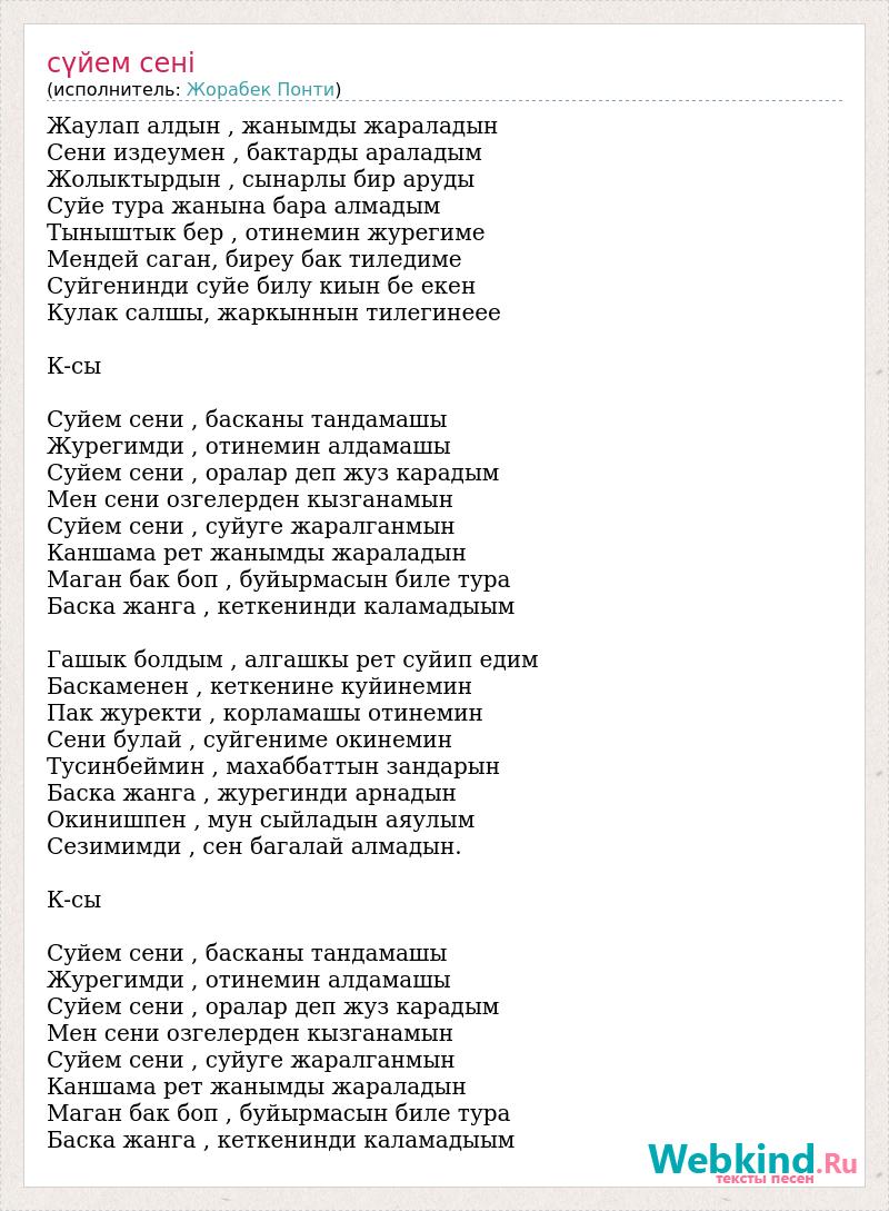 Жаулап алдын , жанымды жараладын Сени издеумен , бактарды араладым Жолыктырдын , сынарлы бир аруды Суйе тура жанына бара алмадым Тыныштык бер , отинемин журегиме Мендей саган, биреу бак тиледиме Суйгенинди суйе билу киын бе екен Кулак салшы, жаркыннын тилегинеее К-сы Суйем сени , басканы тандамашы Журегимди , отинемин алдамашы Суйем сени , оралар деп жуз карадым Мен сени озгелерден кызганамын Суйем сени , суйуге жаралганмын Каншама рет жанымды жараладын Маган бак боп , буйырмасын биле тура Баска жанга , кеткенинди каламадыым Гашык болдым , алгашкы рет суйип едим Баскаменен , кеткенине куйинемин Пак журекти , корламашы отинемин Сени булай , суйгениме окинемин Тусинбеймин , махаббаттын зандарын Баска жанга , журегинди арнадын Окинишпен , мун сыйладын аяулым Сезимимди , сен багалай алмадын. К-сы Суйем сени , басканы тандамашы Журегимди , отинемин алдамашы Суйем сени , оралар деп жуз карадым Мен сени озгелерден кызганамын Суйем сени , суйуге жаралганмын Каншама рет жанымды жараладын Маган бак боп , буйырмасын биле тура Баска жанга , кеткенинди каламадыым