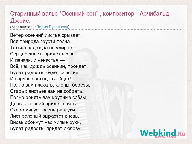 А как ты думаешь, о чем песня "Старинный вальс "Осенний сон" , композитор - Арчибальд Джойс. Лидия Русланов" ?