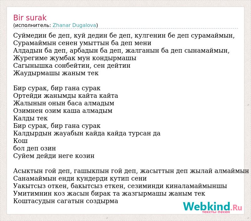 Суймедин бе деп, куй дедин бе деп, кулгенин бе деп сурамаймын, Сурамаймын сенен умыттын ба деп мени Алдадын ба деп, арбадын ба деп, жалганын ба деп сынамаймын, Журегиме жумбак мун кондырмашы Сагынышка сонбейтин, сен дейтин Жаудырмашы жаным тек Бир сурак, бир гана сурак Ортейди жанымды кайта кайта Жалынын онын баса алмадым Озимнен озим каша алмадым Калды тек Бир сурак, бир гана сурак Калдырдын жауабын кайда кайда турсан да Кош бол деп озин Суйем дейди неге козин Асыктын гой деп, гашыкпын гой деп, жасыттын деп жылай алмаймын Санамаймын енди кундерди кутип сени Уакытсыз откен, бакытсыз еткен, сезиминди киналамаймыншы Умитимнин коз жасын бирак та жазгырмашы жаным тек Коштасудын сагатын создырма