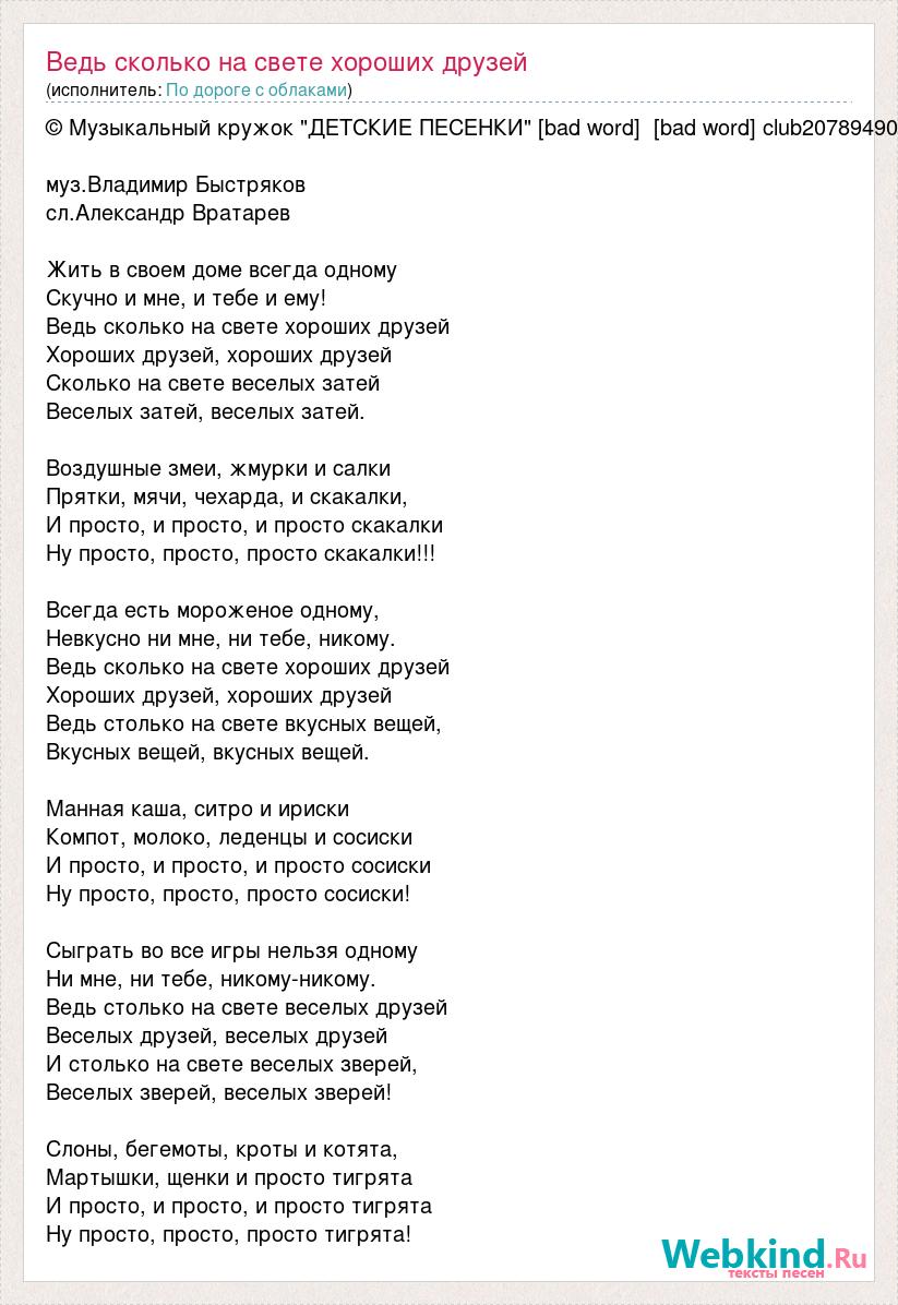 © Музыкальный кружок "ДЕТСКИЕ ПЕСЕНКИ" [bad word] [bad word] club20789490 муз.Владимир Быстряков сл.Александр Вратарев Жить в своем доме всегда одному Скучно и мне, и тебе и ему! Ведь сколько на свете хороших друзей Хороших друзей, хороших друзей Сколько на свете веселых затей Веселых затей, веселых затей. Воздушные змеи, жмурки и салки Прятки, мячи, чехарда, и скакалки, И просто, и просто, и просто скакалки Ну просто, просто, просто скакалки!!! Всегда есть мороженое одному, Невкусно ни мне, ни тебе, никому. Ведь сколько на свете хороших друзей Хороших друзей, хороших друзей Ведь столько на свете вкусных вещей, Вкусных вещей, вкусных вещей. Манная каша, ситро и ириски Компот, молоко, леденцы и сосиски И просто, и просто, и просто сосиски Ну просто, просто, просто сосиски! Сыграть во все игры нельзя одному Ни мне, ни тебе, никому-никому. Ведь столько на свете веселых друзей Веселых друзей, веселых друзей И столько на свете веселых зверей, Веселых зверей, веселых зверей! Слоны, бегемоты, кроты и котята, Мартышки, щенки и просто тигрята И просто, и просто, и просто тигрята Ну просто, просто, просто тигрята!