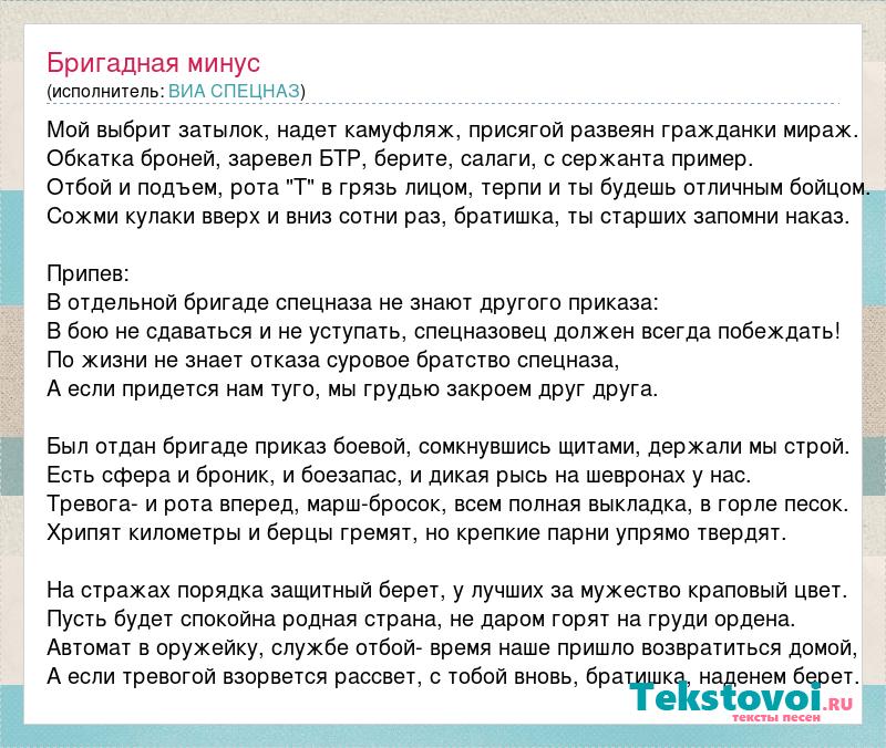 Мой выбрит затылок, надет камуфляж, присягой развеян гражданки мираж. Обкатка броней, заревел БТР, берите, салаги, с сержанта пример. Отбой и подъем, рота "Т" в грязь лицом, терпи и ты будешь отличным бойцом. Сожми кулаки вверх и вниз сотни раз, братишка, ты старших запомни наказ. Припев: В отдельной бригаде спецназа не знают другого приказа: В бою не сдаваться и не уступать, спецназовец должен всегда побеждать! По жизни не знает отказа суровое братство спецназа, А если придется нам туго, мы грудью закроем друг друга. Был отдан бригаде приказ боевой, сомкнувшись щитами, держали мы строй. Есть сфера и броник, и боезапас, и дикая рысь на шевронах у нас. Тревога- и рота вперед, марш-бросок, всем полная выкладка, в горле песок. Хрипят километры и берцы гремят, но крепкие парни упрямо твердят. На стражах порядка защитный берет, у лучших за мужество краповый цвет. Пусть будет спокойна родная страна, не даром горят на груди ордена. Автомат в оружейку, службе отбой- время наше пришло возвратиться домой, А если тревогой взорвется рассвет, с тобой вновь, братишка, наденем берет.