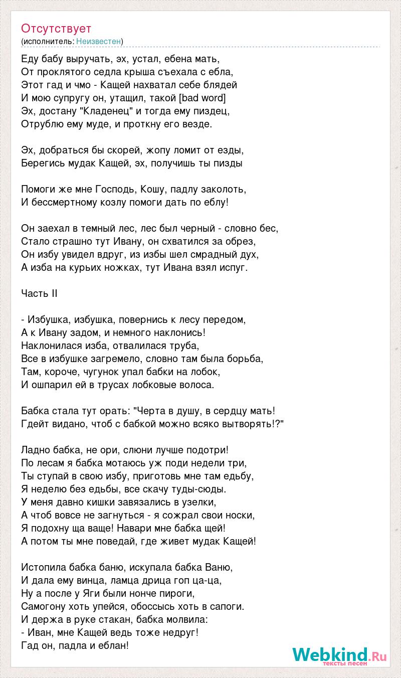 Еду бабу выручать, эх, устал, ебена мать, От проклятого седла крыша съехала с ебла, Этот гад и чмо - Кащей нахватал себе блядей И мою супругу он, утащил, такой [bad word] Эх, достану "Кладенец" и тогда ему пиздец, Отрублю ему муде, и проткну его везде. Эх, добраться бы скорей, жопу ломит от езды, Берегись мудак Кащей, эх, получишь ты пизды Помоги же мне Господь, Кошу, падлу заколоть, И бессмертному козлу помоги дать по еблу! Он заехал в темный лес, лес был черный - словно бес, Стало страшно тут Ивану, он схватился за обрез, Он избу увидел вдруг, из избы шел смрадный дух, А изба на курьих ножках, тут Ивана взял испуг. Часть II - Избушка, избушка, повернись к лесу передом, А к Ивану задом, и немного наклонись! Наклонилася изба, отвалилася труба, Все в избушке загремело, словно там была борьба, Там, короче, чугунок упал бабки на лобок, И ошпарил ей в трусах лобковые волоса. Бабка стала тут орать: "Черта в душу, в сердцу мать! Гдейт видано, чтоб с бабкой можно всяко вытворять!?" Ладно бабка, не ори, слюни лучше подотри! По лесам я бабка мотаюсь уж поди недели три, Ты ступай в свою избу, приготовь мне там едьбу, Я неделю без едьбы, все скачу туды-сюды. У меня давно кишки завязались в узелки, А чтоб вовсе не загнуться - я сожрал свои носки, Я подохну ща ваще! Навари мне бабка щей! А потом ты мне поведай, где живет мудак Кащей! Истопила бабка баню, искупала бабка Ваню, И дала ему винца, ламца дрица гоп ца-ца, Ну а после у Яги были нонче пироги, Самогону хоть упейся, обоссысь хоть в сапоги. И держа в руке стакан, бабка молвила: - Иван, мне Кащей ведь тоже недруг! Гад он, падла и еблан!