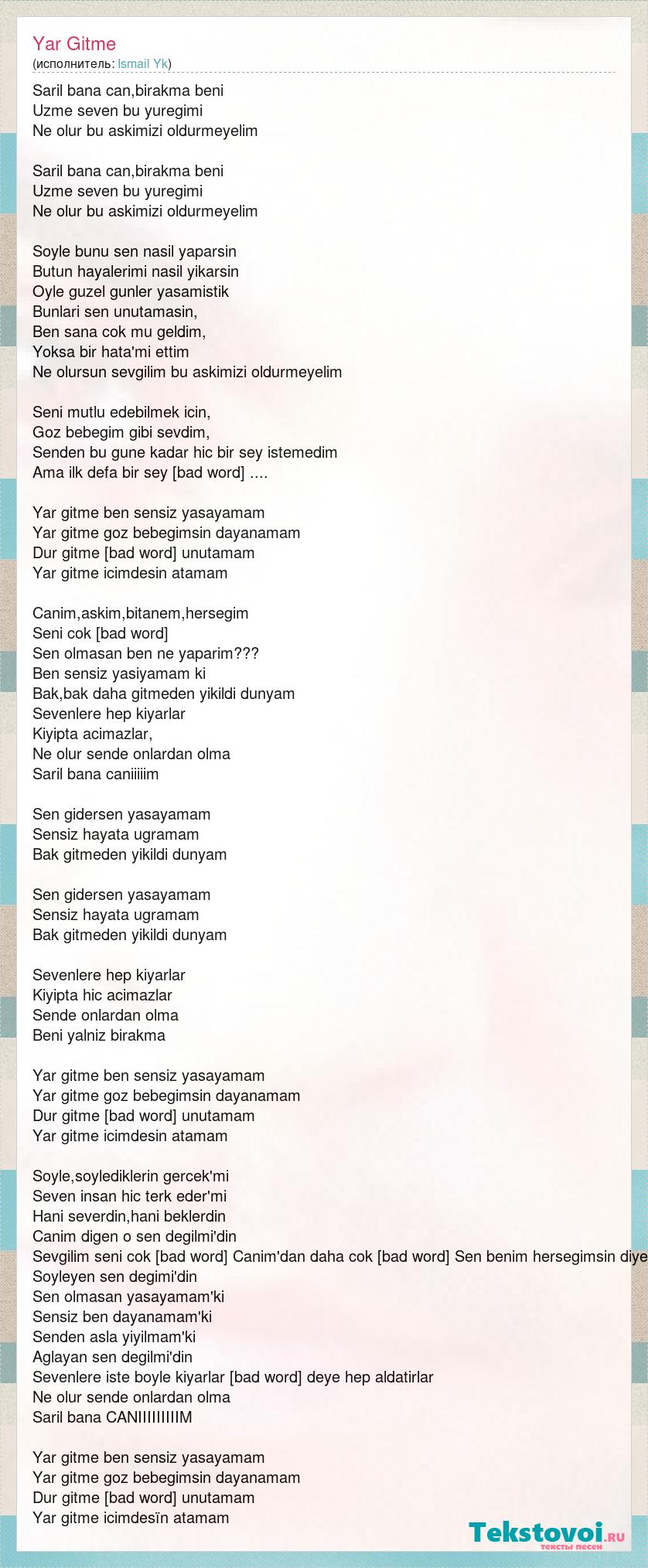 Saril bana can,birakma beni Uzme seven bu yuregimi Ne olur bu askimizi oldurmeyelim Saril bana can,birakma beni Uzme seven bu yuregimi Ne olur bu askimizi oldurmeyelim Soyle bunu sen nasil yaparsin Butun hayalerimi nasil yikarsin Oyle guzel gunler yasamistik Bunlari sen unutamasin, Ben sana cok mu geldim, Yoksa bir hata'mi ettim Ne olursun sevgilim bu askimizi oldurmeyelim Seni mutlu edebilmek icin, Goz bebegim gibi sevdim, Senden bu gune kadar hic bir sey istemedim Ama ilk defa bir sey istiyorum..... Yar gitme ben sensiz yasayamam Yar gitme goz bebegimsin dayanamam Dur gitme seviyorum unutamam Yar gitme icimdesin atamam Canim,askim,bitanem,hersegim Seni cok seviyorum, Sen olmasan ben ne yaparim??? Ben sensiz yasiyamam ki Bak,bak daha gitmeden yikildi dunyam Sevenlere hep kiyarlar Kiyipta acimazlar, Ne olur sende onlardan olma Saril bana caniiiiim Sen gidersen yasayamam Sensiz hayata ugramam Bak gitmeden yikildi dunyam Sen gidersen yasayamam Sensiz hayata ugramam Bak gitmeden yikildi dunyam Sevenlere hep kiyarlar Kiyipta hic acimazlar Sende onlardan olma Beni yalniz birakma Yar gitme ben sensiz yasayamam Yar gitme goz bebegimsin dayanamam Dur gitme seviyorum unutamam Yar gitme icimdesin atamam Soyle,soylediklerin gercek'mi Seven insan hic terk eder'mi Hani severdin,hani beklerdin Canim digen o sen degilmi'din Sevgilim seni cok ozluyorum Canim'dan daha cok seviyorum Sen benim hersegimsin diye Soyleyen sen degimi'din Sen olmasan yasayamam'ki Sensiz ben dayanamam'ki Senden asla yiyilmam'ki Aglayan sen degilmi'din Sevenlere iste boyle kiyarlar Seviyorum deye hep aldatirlar Ne olur sende onlardan olma Saril bana CANIIIIIIIIIM Yar gitme ben sensiz yasayamam Yar gitme goz bebegimsin dayanamam Dur gitme seviyorum unutamam Yar gitme icimdesïn atamam