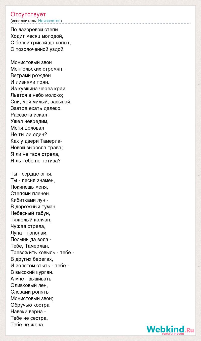 По лазоревой степи Ходит месяц молодой, С белой гривой до копыт, С позолоченной уздой. Монистовый звон Монгольских стремян - Ветрами рожден И ливнями прян. Из кувшина через край Льется в небо молоко; Спи, мой милый, засыпай, Завтра ехать далеко. Рассвета искал - Ушел невредим, Меня целовал Не ты ли один? Как у двери Тамерла- Новой выросла трава; Я ли не твоя стрела, Я ль тебе не тетива? Ты - сердце огня, Ты - песня знамен, Покинешь меня, Степями пленен. Кибитками лун - В дорожный туман, Небесный табун, Тяжелый колчан; Чужая стрела, Луна - пополам, Полынь да зола - Тебе, Тамерлан. Тревожить ковыль - тебе - В других берегах, И золотом стыть - тебе - В высокий курган. А мне - вышивать Оливковый лен, Слезами ронять Монистовый звон; Обручью костра Навеки верна - Тебе не сестра, Тебе не жена.