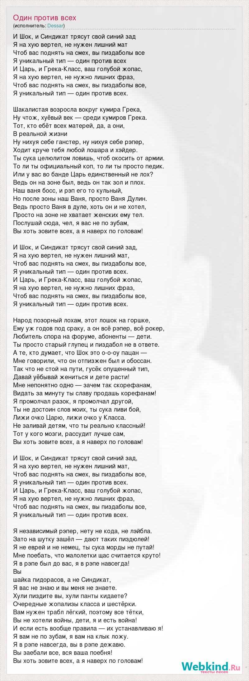 И Шок, и Синдикат трясут свой синий зад Я на хую вертел, не нужен лишний мат Чтоб вас поднять на смех, вы пиздаболы все Я уникальный тип — один против всех И Царь, и Грека-Класс, ваш голубой жопас, Я на хую вертел, не нужно лишних фраз, Чтоб вас поднять на смех, вы пиздаболы все, Я уникальный тип — один против всех. Шакалистая возросла вокруг кумира Грека, Ну чтож, хуёвый век — среди кумиров Грека. Тот, кто ебёт всех матерей, да, а они, В реальной жизни Ну нихуя себе ганстер, ну нихуя себе рэпер, Ходит круче тебя любой лошара и хэйдер. Ты сука целюлитом ловишь, чтоб окосить от армии. То ли ты официальный коп, то ли ты просто педик. Или у вас во банде Царь единственный не лох? Ведь он на зоне был, ведь он так зол и плох. Наш ваня босс, и рэп его то кульный, Но после зоны наш Ваня, просто Ваня Дулин. Ведь просто Ваня в дуле, хоть он и не хотел, Просто на зоне не хватает женских ему тел. Послушай сюда, чел, я вас не по зубам, Вы хоть зовите всех, а я наверх по головам! И Шок, и Синдикат трясут свой синий зад, Я на хую вертел, не нужен лишний мат, Чтоб вас поднять на смех, вы пиздаболы все, Я уникальный тип — один против всех. И Царь, и Грека-Класс, ваш голубой жопас, Я на хую вертел, не нужно лишних фраз, Чтоб вас поднять на смех, вы пиздаболы все, Я уникальный тип — один против всех. Народ позорный лохам, этот лошок на горшке, Ему уж годов под сраку, а он всё рэпер, всё рокер, Любитель спора на форуме, абоненты — дети. Ты просто старый глупец и пиздабол не в ответе. А те, кто думает, что Шок это о-о-оу пацан — Мне говорили, что он отпизжен был и обоссан. Так что не стой на пути, гусёк опущенный тип, Давай уёбывай жениться и дете расти! Мне непонятно одно — зачем так скорефанам, Видать за минуту ты славу продашь корефанам! Я промолчал разок, я промолчал другой, Ты не достоин слов моих, ты сука ливи бой, Лижи очко Царю, лижи очко у Класса. Не заливай детям, что ты реально классный! Тот у кого мозги, рассудит лучше сам, Вы хоть зовите всех, а я наверх по головам! И Шок, и Синдикат трясут свой синий зад, Я на хую вертел, не нужен лишний мат, Чтоб вас поднять на смех, вы пиздаболы все, Я уникальный тип — один против всех. И Царь, и Грека-Класс, ваш голубой жопас, Я на хую вертел, не нужно лишних фраз, Чтоб вас поднять на смех, вы пиздаболы все, Я уникальный тип — один против всех. Я независимый рэпер, нету не кода, не лэйбла. Зато на шутку зашёл — дают таких пиздюлей! Я не еврей и не немец, ты сука морды не путай! Мне поебать, что малолетки щас считается круто! Я в рэпе был до вас, я в рэпе навсегда! Вы шайка пидорасов, а не Синдикат, Я вас не знаю и вы меня не знаете. Хули пиздите вы, хули панты кидаете? Очередные жопализы класса и шестёрки. Вам нужен трабл лёгкий, поэтому все тётки, Вы не хотели войны, дети, я и есть война! И если есть вообще правила — их устанавливаю я! Я вам не по зубам, я вам на клык ложу. Я в рэпе навсегда, вы в рэпе дежавю. Вы заебали все, вся ваша поебня! Вы хоть зовите всех, а я наверх по головам!