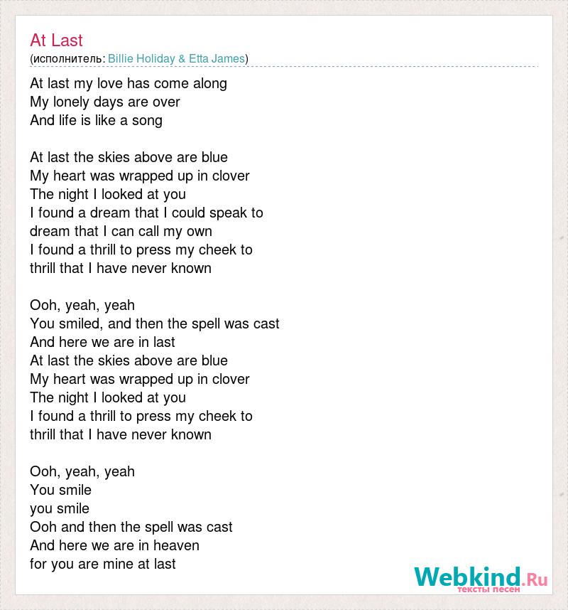 At last my love has come along My lonely days are over And life is like a song At last the skies above are blue My heart was wrapped up in clover The night I looked at you I found a dream that I could speak to dream that I can call my own I found a thrill to press my cheek to thrill that I have never known Ooh, yeah, yeah You smiled, and then the spell was cast And here we are in last At last the skies above are blue My heart was wrapped up in clover The night I looked at you I found a thrill to press my cheek to thrill that I have never known Ooh, yeah, yeah You smile you smile Ooh and then the spell was cast And here we are in heaven for you are mine at last