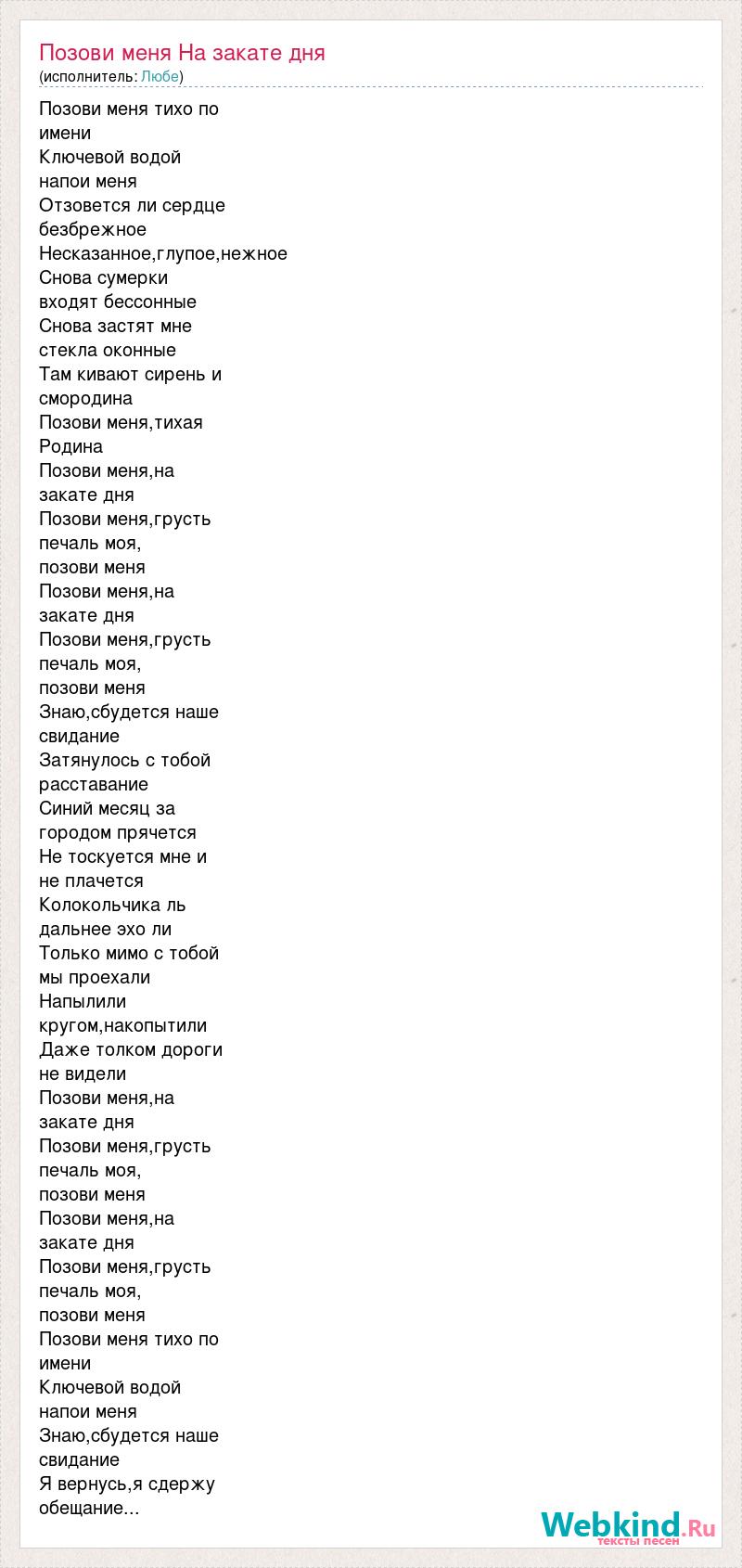 Позови меня тихо по имени Ключевой водой напои меня Отзовется ли сердце безбрежное Несказанное,глупое,нежное Снова сумерки входят бессонные Снова застят мне стекла оконные Там кивают сирень и смородина Позови меня,тихая Родина Позови меня,на закате дня Позови меня,грусть печаль моя, позови меня Позови меня,на закате дня Позови меня,грусть печаль моя, позови меня Знаю,сбудется наше свидание Затянулось с тобой расставание Синий месяц за городом прячется Не тоскуется мне и не плачется Колокольчика ль дальнее эхо ли Только мимо с тобой мы проехали Напылили кругом,накопытили Даже толком дороги не видели Позови меня,на закате дня Позови меня,грусть печаль моя, позови меня Позови меня,на закате дня Позови меня,грусть печаль моя, позови меня Позови меня тихо по имени Ключевой водой напои меня Знаю,сбудется наше свидание Я вернусь,я сдержу обещание...