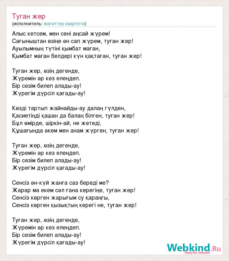 Алыс кетсем, мен сені аңсай жүрем! Сағыныштан өзіңе ән сап жүрем, туған жер! Ауылымның түтіні қымбат маған, Қымбат маған белдері күн қақтаған, туған жер! Туған жер, өзің дегенде, Жүремін әр кез елеңдеп. Бір сезім билеп алады-ау! Жүрегім дүрсіл қағады-ау! Көзді тартып жайнайды-ау далаң гүлден, Қасиетіңді қашан да балаң білген, туған жер! Бұл өмірде, шіркін-ай, не жетеді, Құшағыңда әкем мен анам жүрген, туған жер! Туған жер, өзің дегенде, Жүремін әр кез елеңдеп. Бір сезім билеп алады-ау! Жүрегім дүрсіл қағады-ау! Сенсіз ән-күй жанға саз береді ме? Жарар ма екем сәл ғана керегіңе, туған жер! Сенсіз көрген жарығым су қараңғы, Сенсіз көрген қызықтың керегі не, туған жер! Туған жер, өзің дегенде, Жүремін әр кез елеңдеп. Бір сезім билеп алады-ау! Жүрегім дүрсіл қағады-ау!