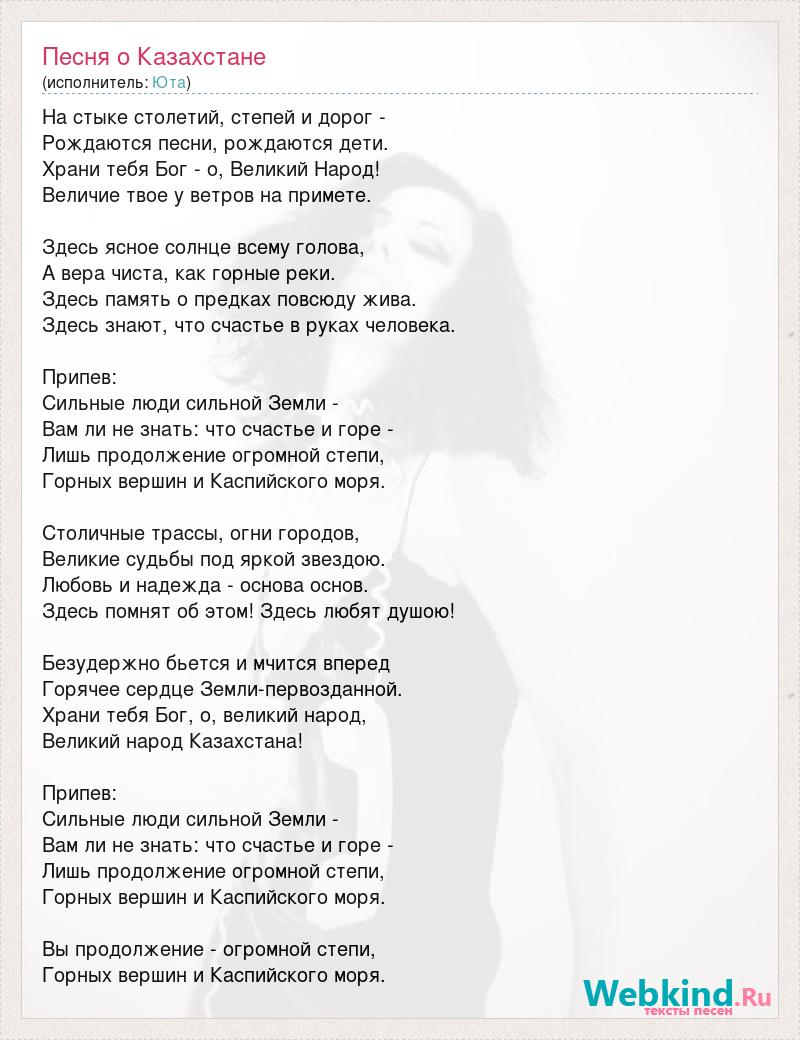 На стыке столетий, степей и дорог - Рождаются песни, рождаются дети. Храни тебя Бог - о, Великий Народ! Величие твое у ветров на примете. Здесь ясное солнце всему голова, А вера чиста, как горные реки. Здесь память о предках повсюду жива. Здесь знают, что счастье в руках человека. Припев: Сильные люди сильной Земли - Вам ли не знать: что счастье и горе - Лишь продолжение огромной степи, Горных вершин и Каспийского моря. Столичные трассы, огни городов, Великие судьбы под яркой звездою. Любовь и надежда - основа основ. Здесь помнят об этом! Здесь любят душою! Безудержно бьется и мчится вперед Горячее сердце Земли-первозданной. Храни тебя Бог, о, великий народ, Великий народ Казахстана! Припев: Сильные люди сильной Земли - Вам ли не знать: что счастье и горе - Лишь продолжение огромной степи, Горных вершин и Каспийского моря. Вы продолжение - огромной степи, Горных вершин и Каспийского моря.