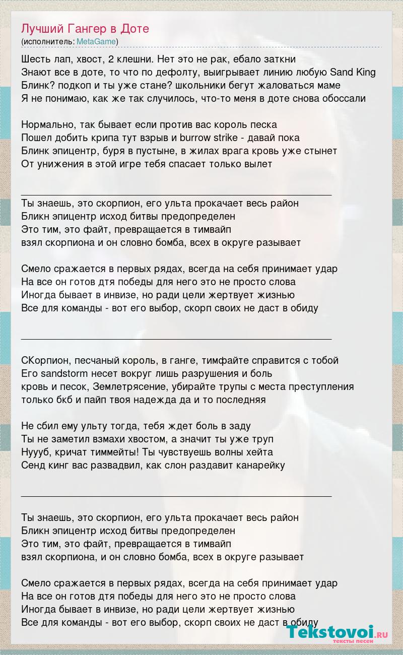 Шесть лап, хвост, 2 клешни. Нет это не рак, ебало заткни Знают все в доте, то что по дефолту, выигрывает линию любую Sand King Блинк? подкоп и ты уже стане? школьники бегут жаловаться маме Я не понимаю, как же так случилось, что-то меня в доте снова обоссали Нормально, так бывает если против вас король песка Пошел добить крипа тут взрыв и burrow strike - давай пока Блинк эпицентр, буря в пустыне, в жилах врага кровь уже стынет От унижения в этой игре тебя спасает только вылет ________________________________________________________ Ты знаешь, это скорпион, его ульта прокачает весь район Бликн эпицентр исход битвы предопределен Это тим, это файт, превращается в тимвайп взял скорпиона и он словно бомба, всех в округе разывает Смело сражается в первых рядах, всегда на себя принимает удар На все он готов дтя победы для него это не просто слова Иногда бывает в инвизе, но ради цели жертвует жизнью Все для команды - вот его выбор, скорп своих не даст в обиду ________________________________________________________ СКорпион, песчаный король, в ганге, тимфайте справится с тобой Его sandstorm несет вокруг лишь разрушения и боль кровь и песок, Землетрясение, убирайте трупы с места преступления только бкб и пайп твоя надежда да и то последняя Не сбил ему ульту тогда, тебя ждет боль в заду Ты не заметил взмахи хвостом, а значит ты уже труп Нуууб, кричат тиммейты! Ты чувствуешь волны хейта Сенд кинг вас развадвил, как слон раздавит канарейку ________________________________________________________ Ты знаешь, это скорпион, его ульта прокачает весь район Бликн эпицентр исход битвы предопределен Это тим, это файт, превращается в тимвайп взял скорпиона, и он словно бомба, всех в округе разывает Смело сражается в первых рядах, всегда на себя принимает удар На все он готов дтя победы для него это не просто слова Иногда бывает в инвизе, но ради цели жертвует жизнью Все для команды - вот его выбор, скорп своих не даст в обиду