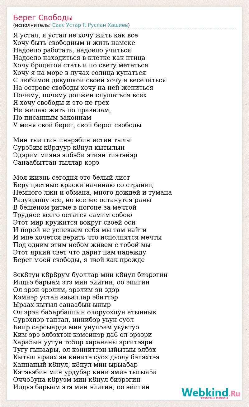 Я устал, я устал не хочу жить как все Хочу быть свободным и жить намеке Надоело работать, надоело учиться Надоело находиться в клетке как птица Хочу бродягой стать и по свету метаться Хочу я на море в лучах солнца купаться С любимой девушкой своей хочу я веселиться На острове свободы хочу на ней жениться Почему, почему должен слушаться всех Я хочу свободы и это не грех Не желаю жить по правилам, По писанным законнам У меня свой берег, свой берег свободы Мин тыалтан инэрэбин истин тылы Сурэ5им к8рдуур к8нул кытылын Эдэрим миэнэ элбэ5и этиэн тиэтэйэр Санаабыттан тыллар кэрэ Моя жизнь сегодня это белый лист Беру цветные краски начинаю со страниц Немного лжи и обмана, много дождей и тумана Разукрашу все, но все же останутся раны В бешеном ритме в погоне за мечтой Труднее всего остатся самим собою Этот мир кружится вокруг своей оси И порой не успеваем себя мы там найти И мне хочется верить что исполнятся мечты Под одним этим небом живем с тобой мы Этот яркий свет что дарит нам надежду Берег моей свободы, я твой как прежде 8ск8тун к8р8рум буоллар мин к8нул биэрэгин Илдьэ барыам этэ мин эйигин, оо эйигин Ол эрэн эрэлим, эрэлим эн эдэр Кэмнэр устан ааьаллар эбиттэр Ыраах кытыл санаабын ыныр Ол эрэн ба5арбаппын олоруохпун атыннык Сурэхпэр таптал, иннибэр уьун суол Биир сарсыарда мин уйул5ам уьуктуо Ким эрэ элбэхтэн кэмсинэр да6 ол эрээри Хара5ын уутун то5ор харананы эргитээри Тугу гынаары, ол кэнниттэн ыйытыы элбэх Кытыл ыраах эн кинитэ суох дьолу бэлэхтээ Ханнаный к8нул, к8нул мин ырыабар Кэтэьэбин мин урдубэр кини эмиэ тыгыа5а Оччо5уна к8руэм мин к8нул биэрэгин Илдьэ барыам этэ мин эйигин, оо эйигин