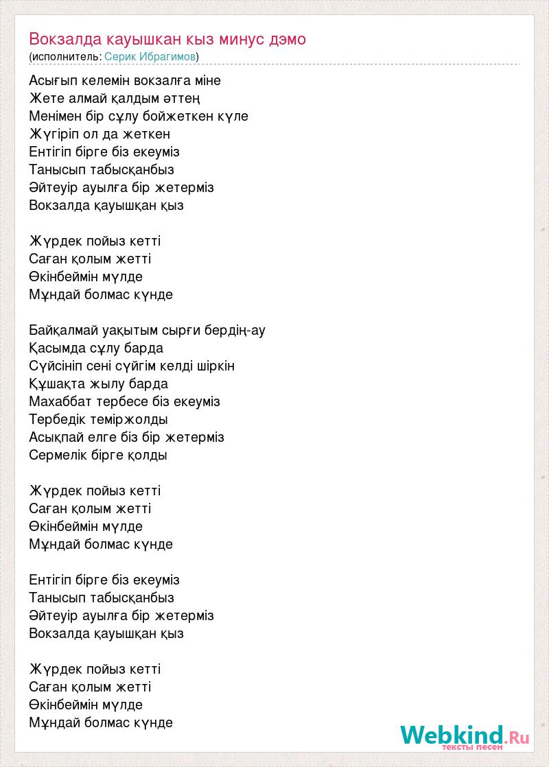 Асығып келемін вокзалға міне Жете алмай қалдым әттең Менімен бір сұлу бойжеткен күле Жүгіріп ол да жеткен Ентігіп бірге біз екеуміз Танысып табысқанбыз Әйтеуір ауылға бір жетерміз Вокзалда қауышқан қыз Жүрдек пойыз кетті Саған қолым жетті Өкінбеймін мүлде Мұндай болмас күнде Байқалмай уақытым сырғи бердің-ау Қасымда сұлу барда Сүйсініп сені сүйгім келді шіркін Құшақта жылу барда Махаббат тербесе біз екеуміз Тербедік теміржолды Асықпай елге біз бір жетерміз Сермелік бірге қолды Жүрдек пойыз кетті Саған қолым жетті Өкінбеймін мүлде Мұндай болмас күнде Ентігіп бірге біз екеуміз Танысып табысқанбыз Әйтеуір ауылға бір жетерміз Вокзалда қауышқан қыз Жүрдек пойыз кетті Саған қолым жетті Өкінбеймін мүлде Мұндай болмас күнде