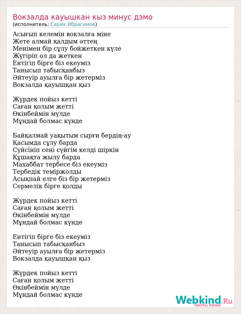 Асығып келемін вокзалға міне Жете алмай қалдым әттең Менімен бір сұлу бойжеткен күле Жүгіріп ол да жеткен Ентігіп бірге біз екеуміз Танысып табысқанбыз Әйтеуір ауылға бір жетерміз Вокзалда қауышқан қыз Жүрдек пойыз кетті Саған қолым жетті Өкінбеймін мүлде Мұндай болмас күнде Байқалмай уақытым сырғи бердің-ау Қасымда сұлу барда Сүйсініп сені сүйгім келді шіркін Құшақта жылу барда Махаббат тербесе біз екеуміз Тербедік теміржолды Асықпай елге біз бір жетерміз Сермелік бірге қолды Жүрдек пойыз кетті Саған қолым жетті Өкінбеймін мүлде Мұндай болмас күнде Ентігіп бірге біз екеуміз Танысып табысқанбыз Әйтеуір ауылға бір жетерміз Вокзалда қауышқан қыз Жүрдек пойыз кетті Саған қолым жетті Өкінбеймін мүлде Мұндай болмас күнде